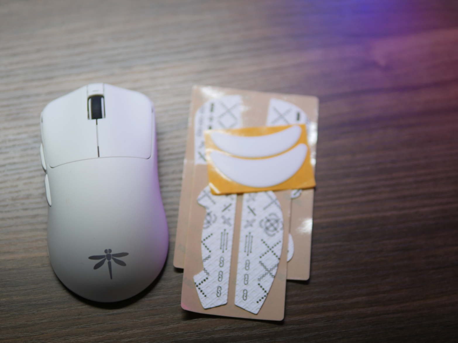 握持手感我感觉都不错,雷柏整个曲线丰满一点,多彩偏扁平一点。雷柏的侧面是和顶部一样的涂层而多彩的侧面没有了涂层而是防滑纹路,摸起来手感一般。二者都送防滑贴和脚贴了,不过多彩送了玻璃脚贴,算是亮点。两款鼠标的整体大小处于中等水准,是比较通用的尺寸。
