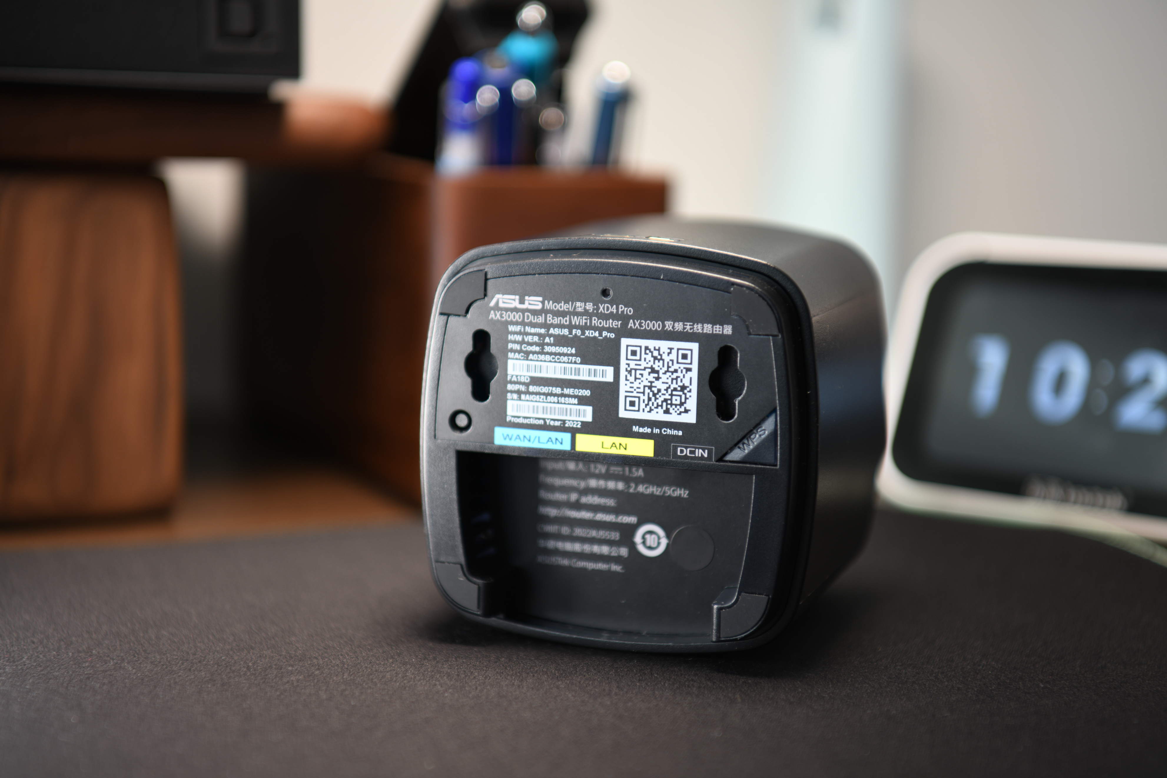 灵耀AX小魔方Pro设计源于“圆润如天,方正如人”的灵感,底部有两个墙壁挂孔,所有接口和开关也在底部,从左到右依次为复位按键、WAN/LAN接口、LAN接口、电源接口、WPS按键。