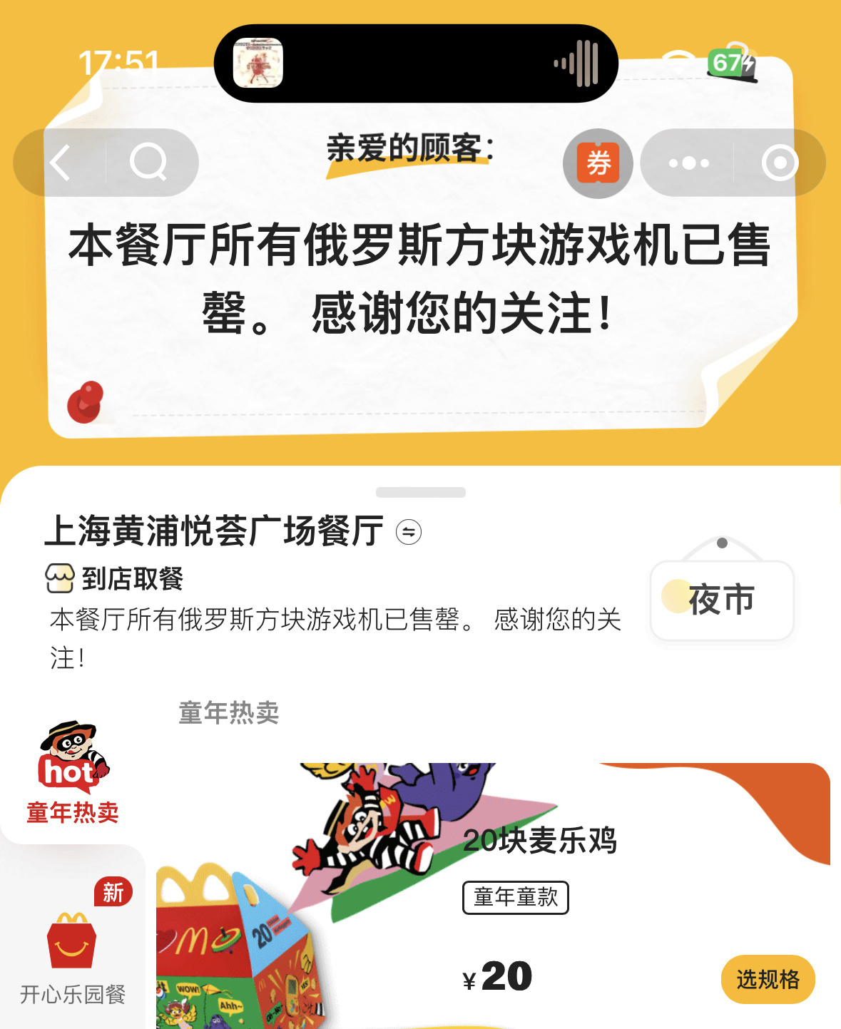 日前麦当劳推出 40 周年庆促销活动,顾客在任意订单加 30 元即可获得一款麦乐鸡形状的掌上游戏机,该掌机于 5 月 24 日发售并限量 40 万台,仅在中国大陆地区发行,由于数量有限并受到炒作影响,许多人不惜加价购买获得这款玩具。