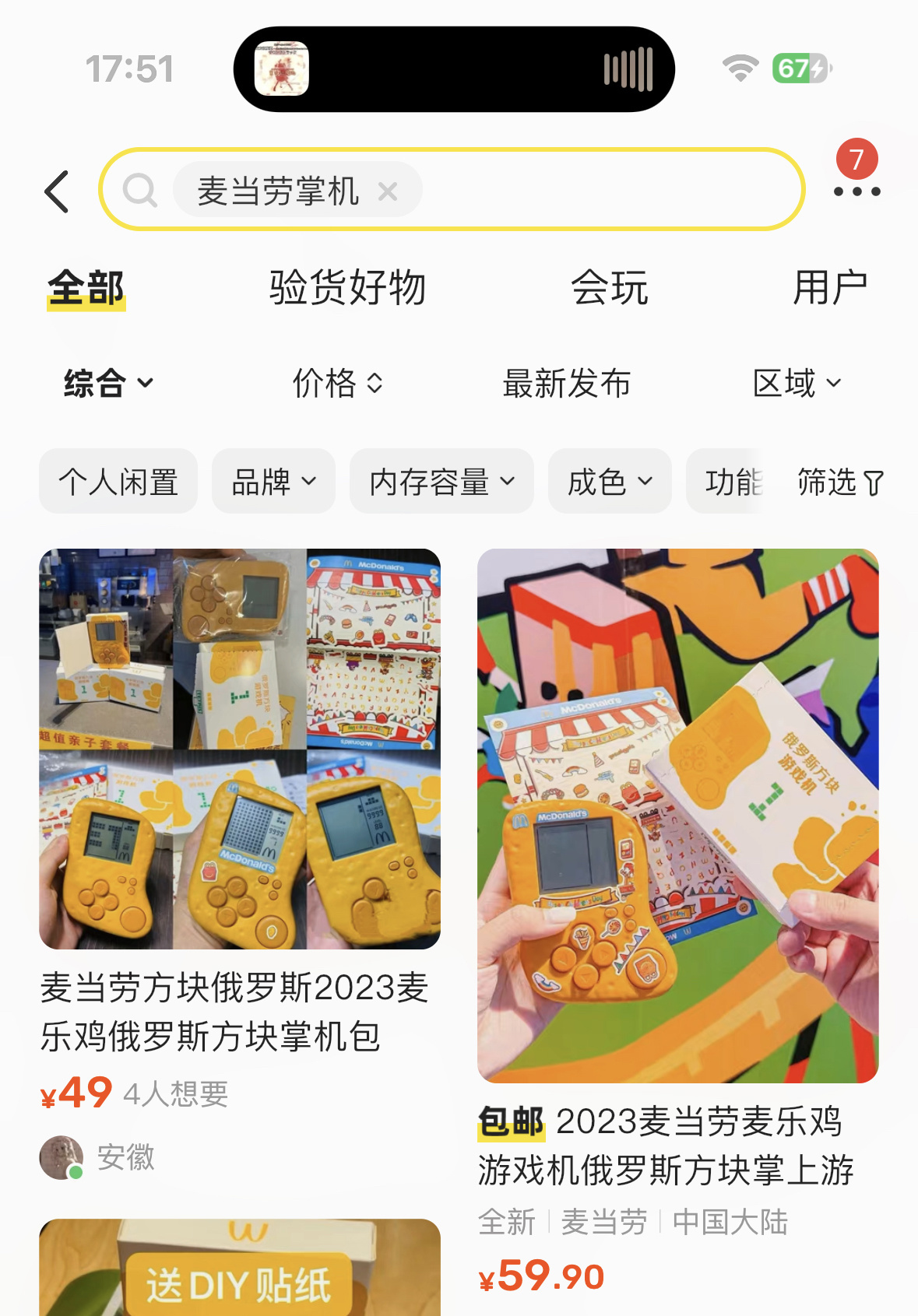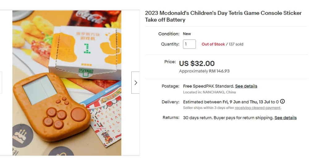 目前,麦当劳官方 App 及小程序中绝大多数餐厅直接打出公告显示“游戏机无货”。而有人反馈许多餐厅门外黄牛排队“加价一倍收”,可见该玩具的热度之高。闲鱼上的价格已经涨到了 60 元不等,而国外藏家也对这款玩具艳羡不已。在 eBay 上,有人已经挂出了 32 美元(约合人民币 226 元)的高价。