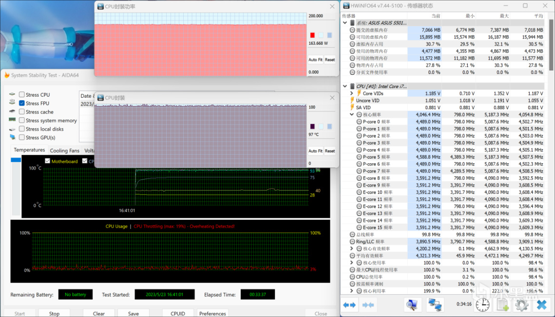 再回到上面提过的问题,该机的系统默认最高性能释放是90W,但考机时处理器的温度并不算高,所以理论上该机还有可解锁的性能上限,实际怎么样?牛叔利用intel XTU解锁该机的功耗上限,并进行了考机稳定性测试,持续时间半小时,结果如下所示:i7 13700F可以稳定跑到160W以上的功率,温度97℃左右,P核频率4.5GHz,E核频率3.6GHz,在持续半小时的考机中稳定输出。这说明了该机的主板供电稳妥,同时散热器也靠谱,完全能支撑160W的i7 13700F满载输出!同时Blender渲染耗时也提升到了4分钟跑完。