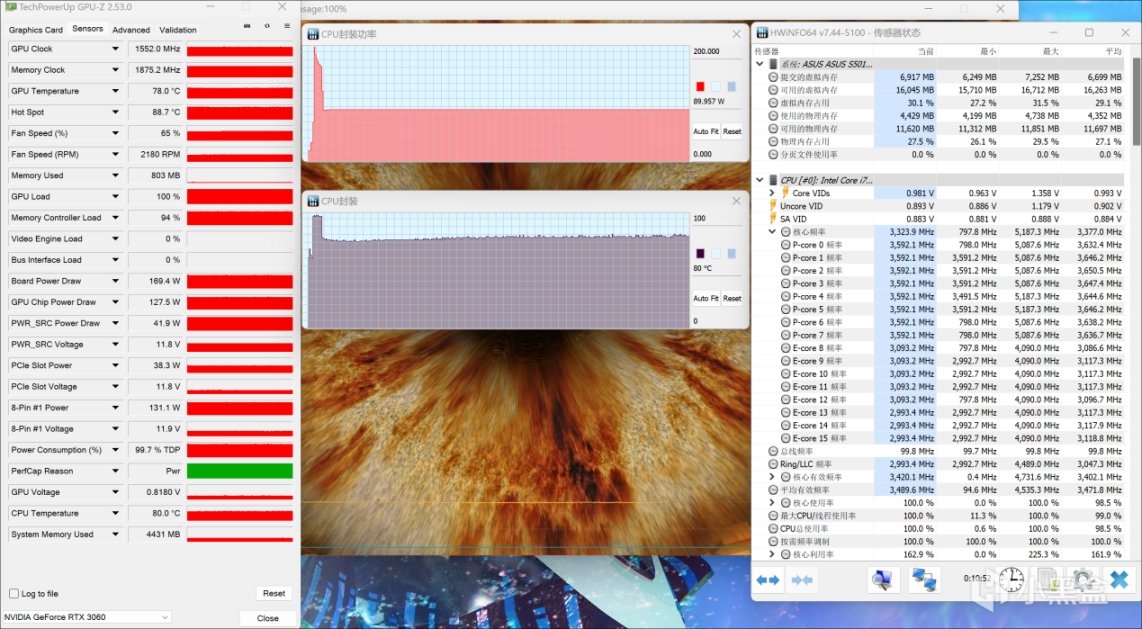 室温25℃左右,增强模式下,利用AIDA64和FurMark对天选X 2023进行双考机满载测试,持续一段时间之后,i7 13700F 处理器功耗处于90W左右,温度90℃,RTX 3060稳定在170W附近,温度78℃,均保持高功耗输出。