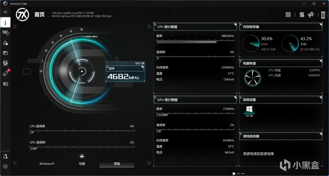 另外,作为品牌游戏主机,该机出厂预装了win11正版系统,内置华硕管家以及奥创中心等应用,性能切换、灯效切换都相当方便。
