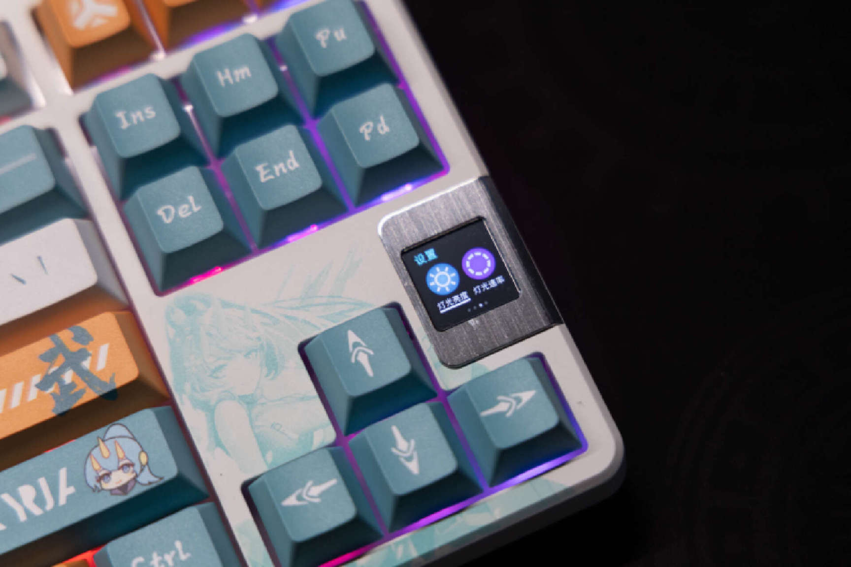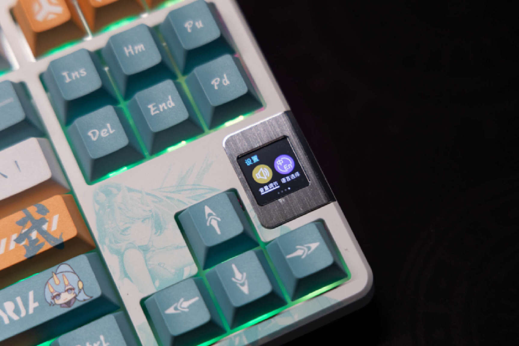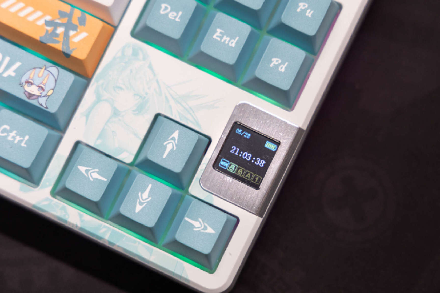 键盘右侧方向键的位置可以看到一个额外的显示屏,这个显示屏尺寸为0.85英寸,采用了金属边框包裹,非常的醒目。