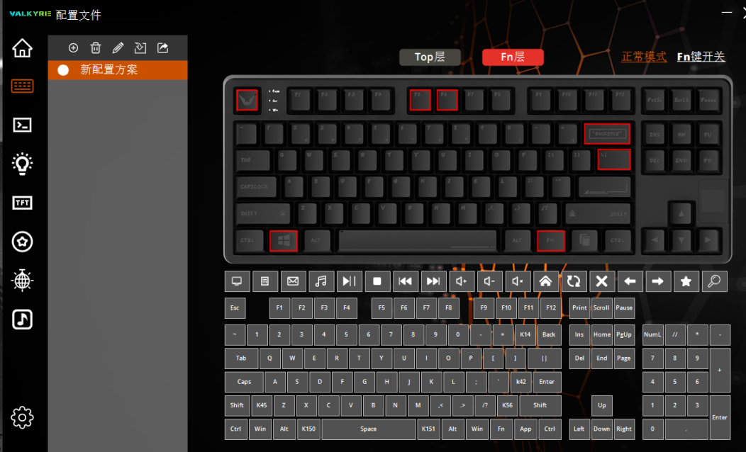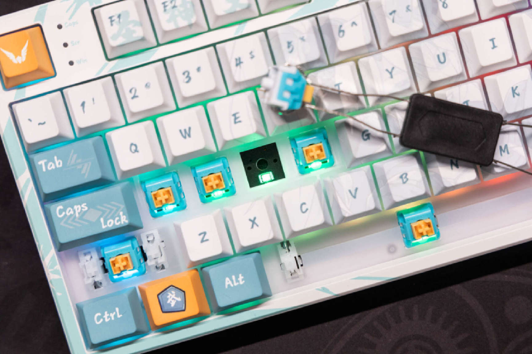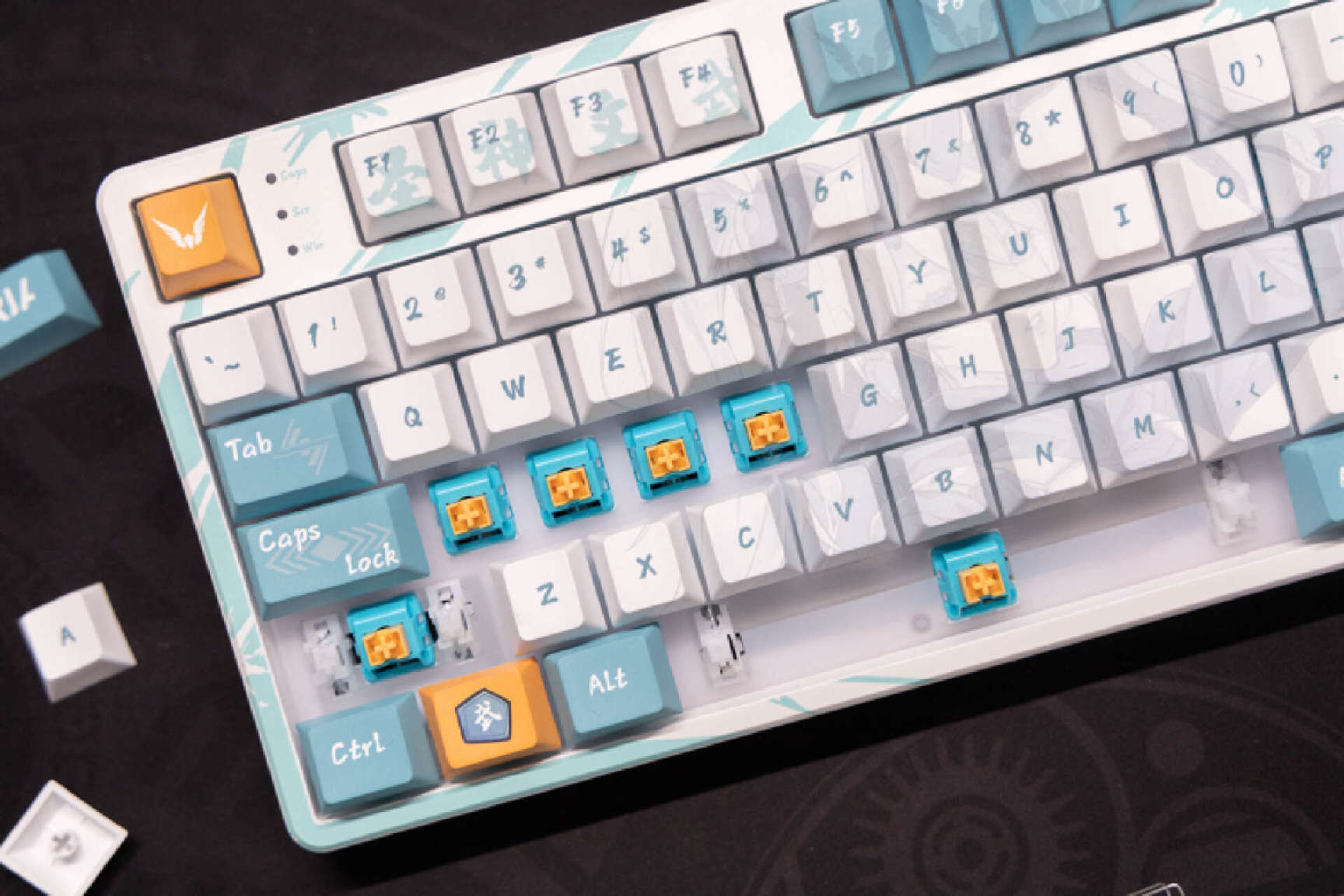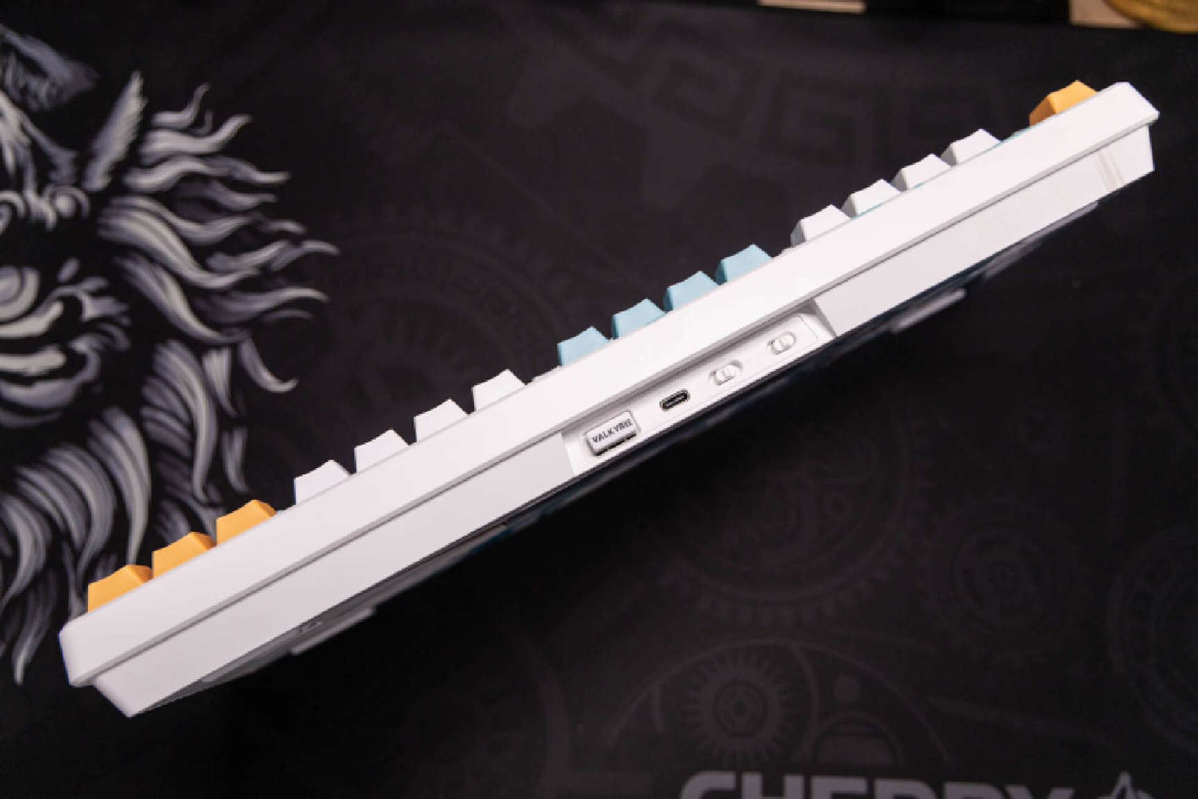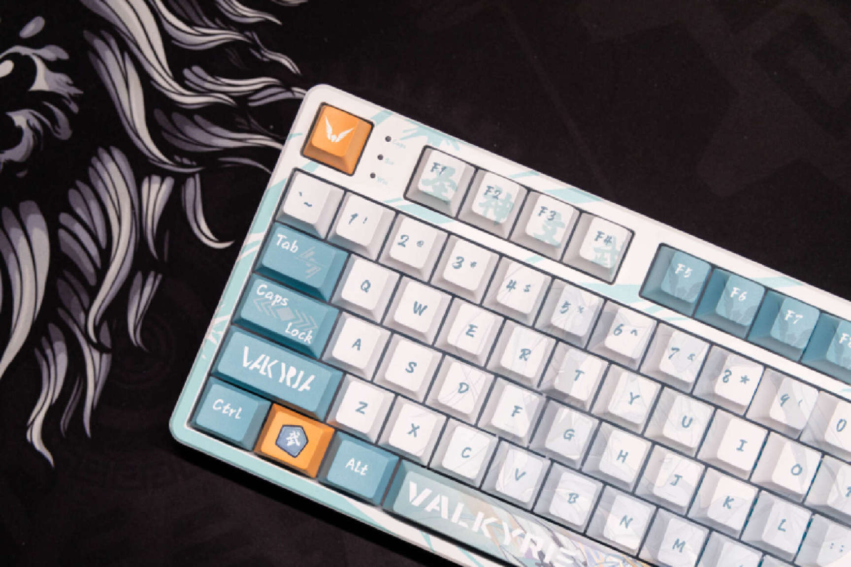 键盘的左侧可以看到瓦尔基里的标识的键帽,在ESC侧边是常规的3个CAP等状态指示灯。