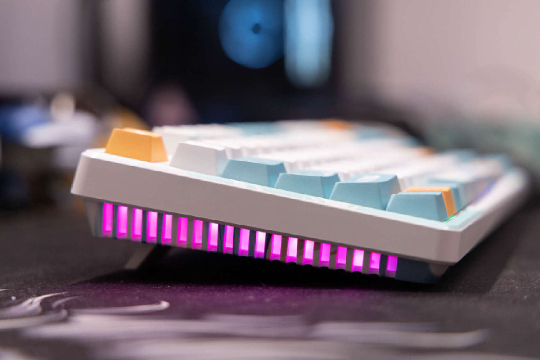 VK87迷雾采用的是87键配列布局,经典的窄边框设计,主题配色融入了浓郁的二次元风格,特殊键帽和键盘外壳都有能看到浓郁的游戏元素。