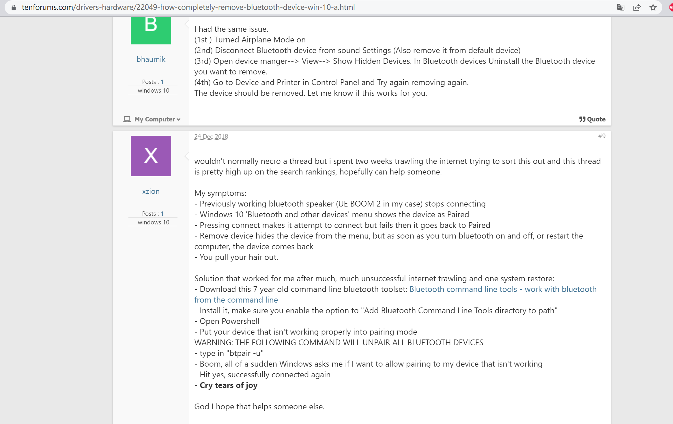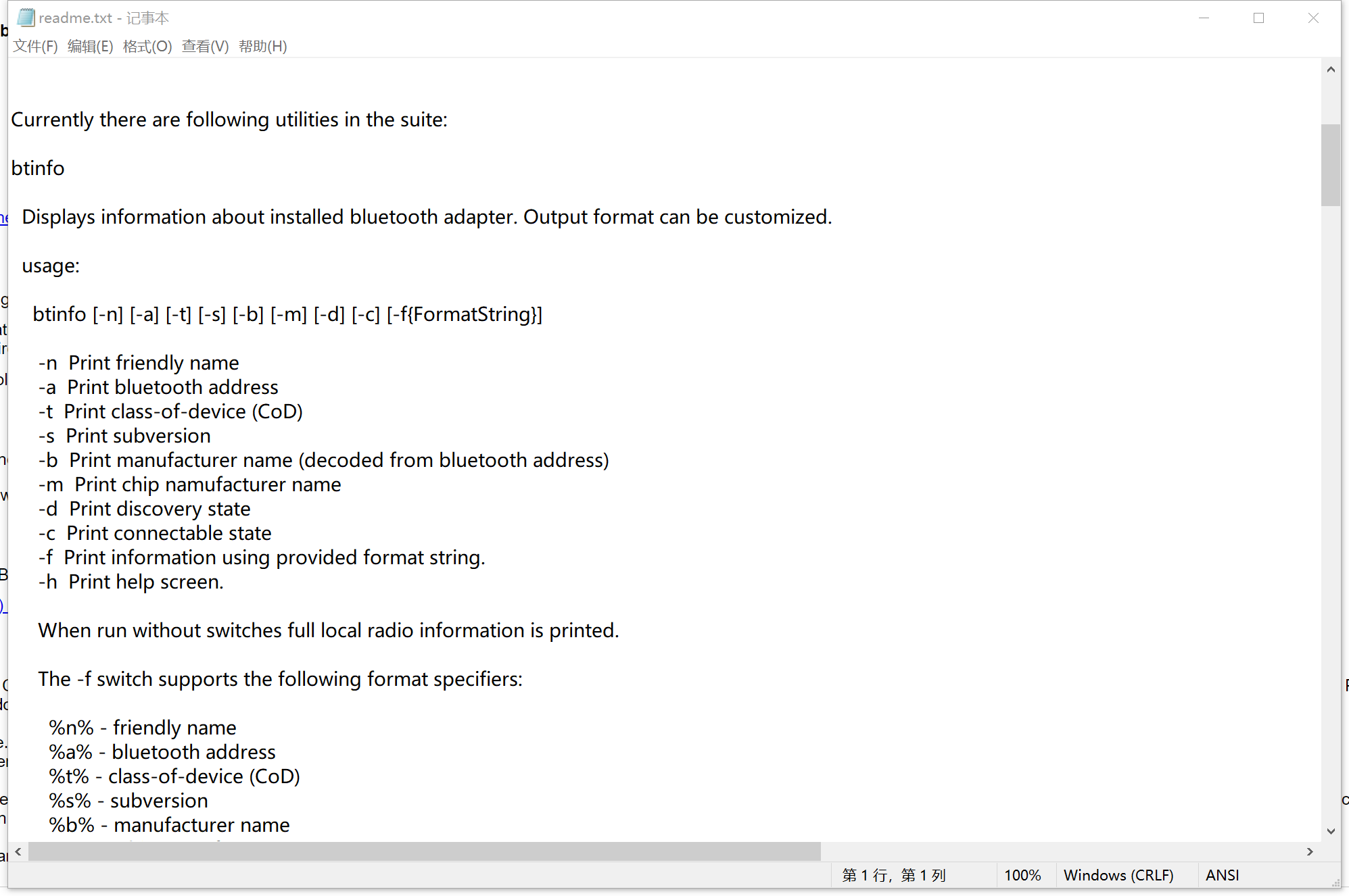 原文大致意思如下:去下载一个已经有7年之久的叫“蓝牙命令行工具”的东西,它可以完善你的蓝牙在windows系统中的控制配置,实现通过脚本进行对蓝牙设备驱动文件的便捷操作。