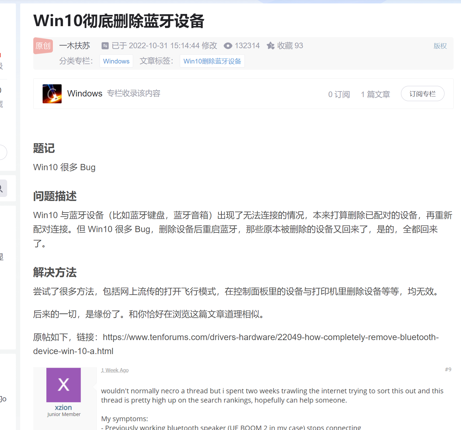 如果蓝牙驱动重新安装或者文件完整性校验也不可以成功,那么就要考虑是不是蓝牙配对信息的问题(这可能就是win10的一个bug?)。