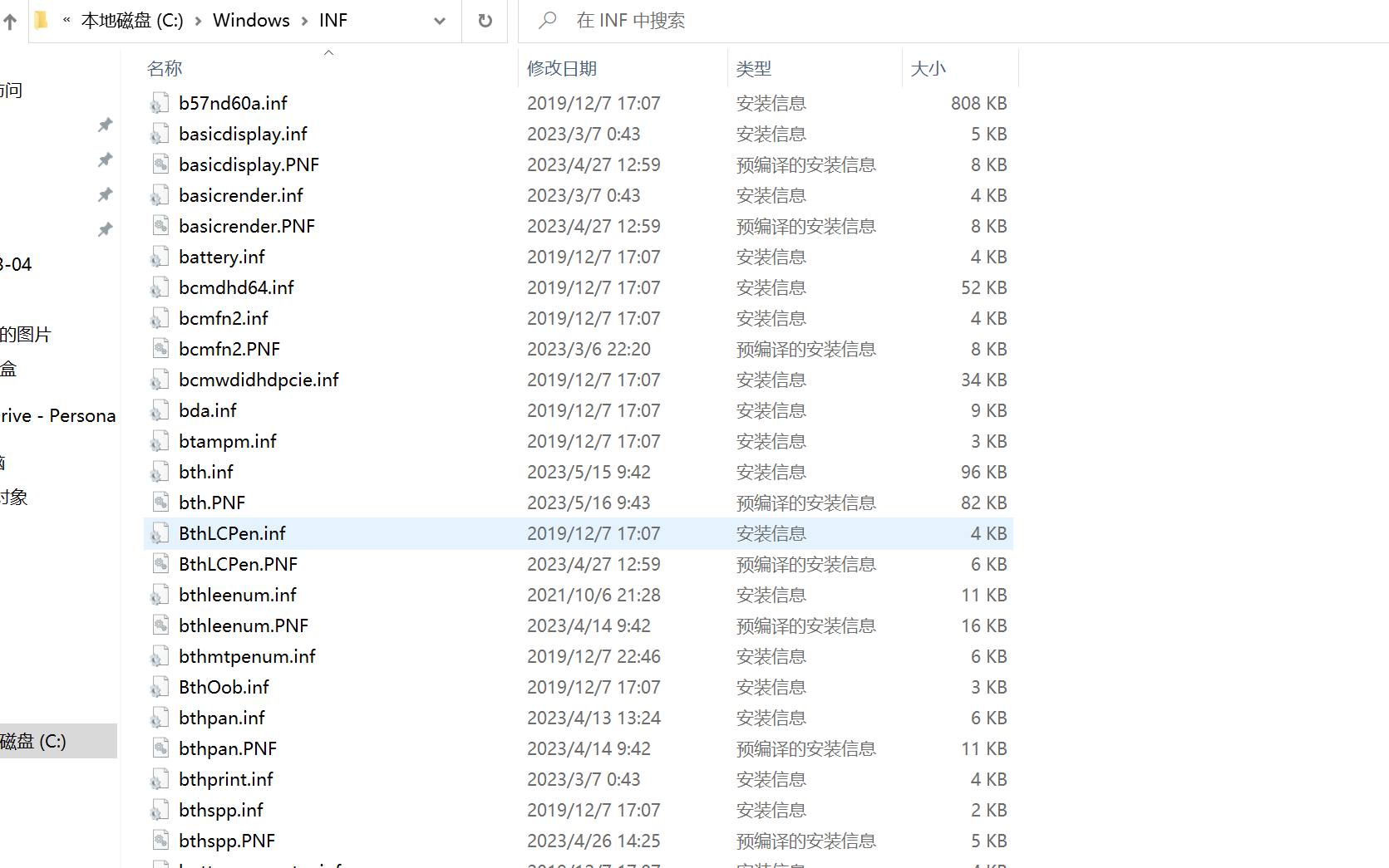 要找到蓝牙信息缓存的位置,可能不是那么容易。虽然微软关于操控设备驱动的.inf文件几乎都隐藏在C:\Windows\INF目录下,但一旦点进去,就能看到密密麻麻的各种.inf文件,单单有“bt”(蓝牙英文bluetooth缩写)的文件就是十几个。