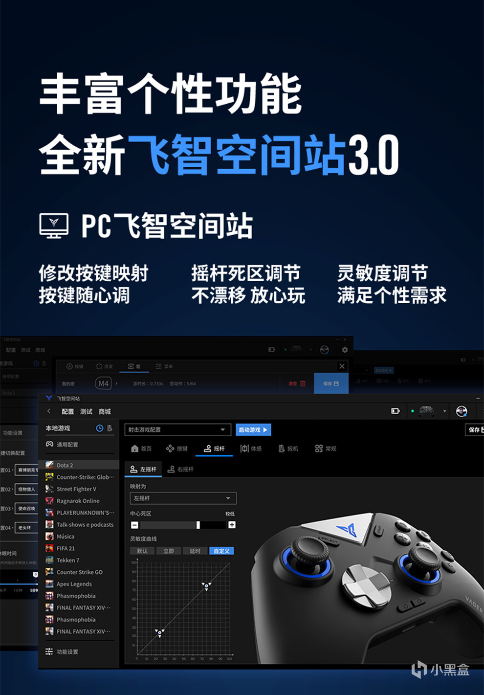 飞智专注研究手柄的力学结构创新,为玩家提供更精准的反馈,更丝滑的手感和更沉浸的交互体验。飞智自研手柄的力学结构体系,重新设计了扳机键、ABXY键、摇杆、十字键等手柄器件。自研转轴八向十字键,灵敏搓招不黏连,突破传统四向十字键,转动丝滑灵动,复杂指令不再拖泥带水。此次还更新了全新的飞智空间站3.0,修改按键映射,按键、灵敏度随心调,满足个性需求。