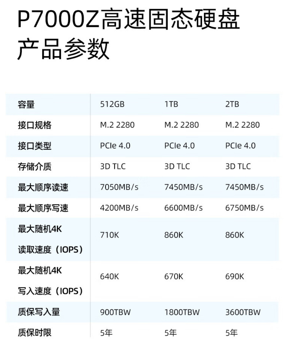 爱国者 P7000Z 固态硬盘 2TB 版读速 7450MB/s,日常售价为 999 元。