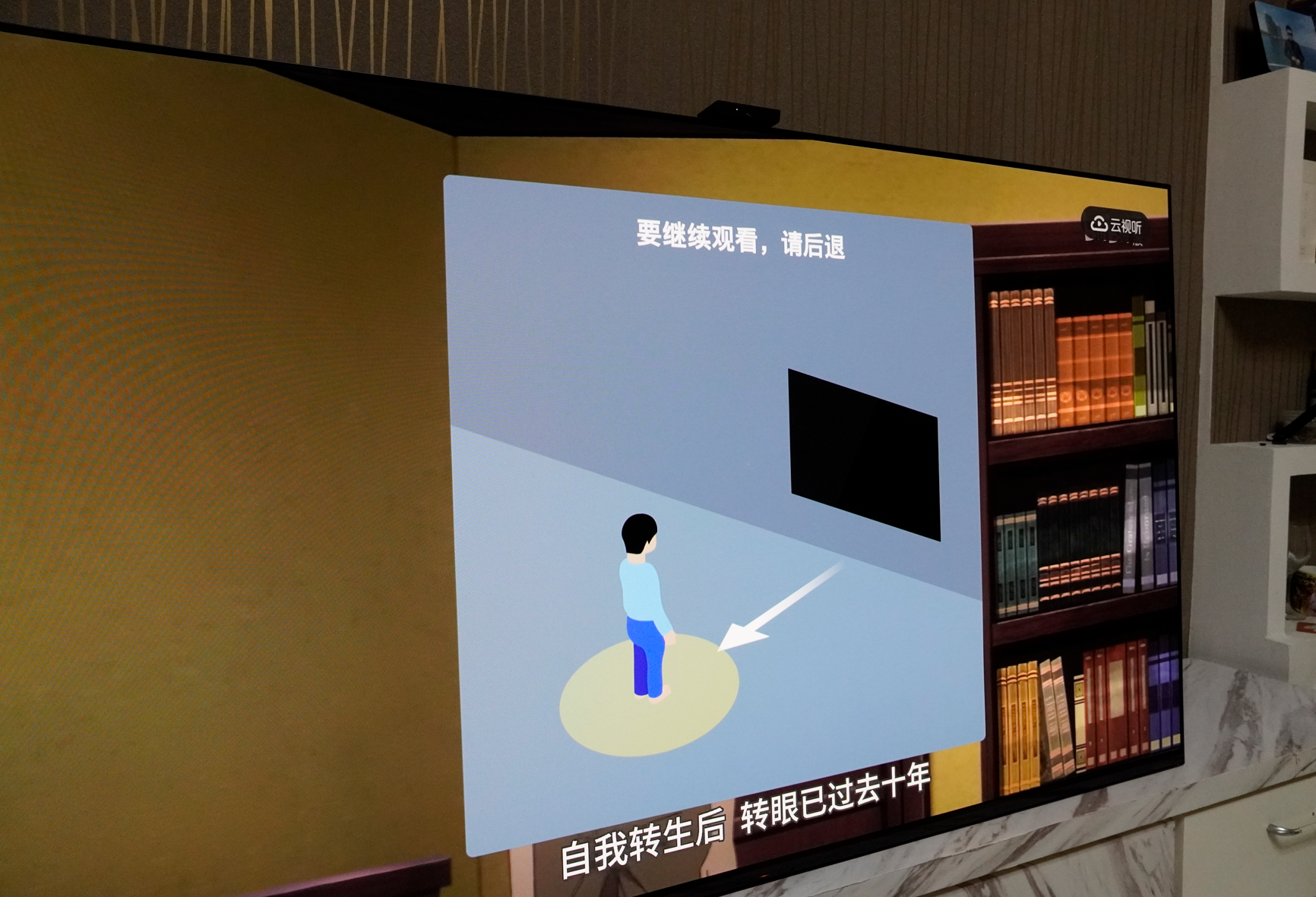 ▲另外一个功能则正中有宝宝家庭的痛点,小宝宝常常会看着看着电视脸就贴到电视上了,这对儿童的视力健康是非常不好的。索尼XR-65A95K拥有距离过近提醒功能,在摄像头识别到有人距离屏幕过近时,会调暗整个屏幕的亮度并弹出超大的提示框,小朋友要是想继续看电视就只能往后退,这要比家长在旁边看着省心,高效多了。
