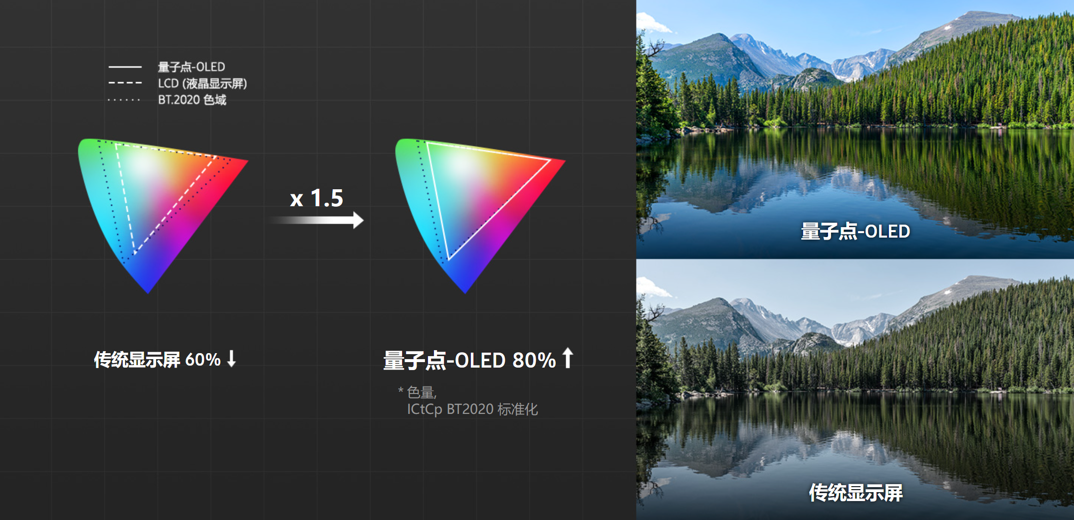▲得益于量子点技术与OLED技术的强强联合,量子点OLED相较于传统的LCD液晶显示屏有更强的色域覆盖,更高的对比度;而相较于普通OLED屏幕则不仅保留了其色彩好,黑色纯净的优点之外,还拥有着更高的亮度、更绚丽的色彩表现及更为优秀的可视角度,显示HDR画面时更加真实。