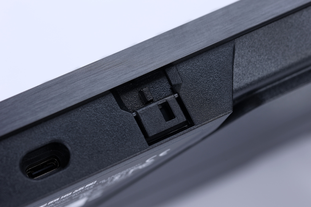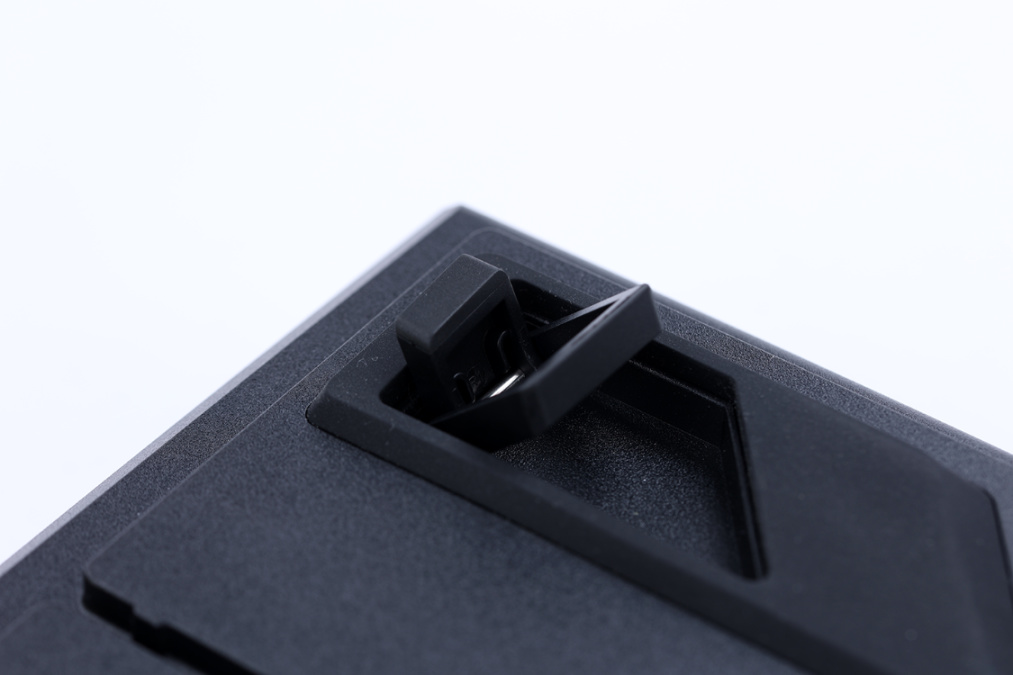 键盘背面顶部两个脚垫均采用了镂空设计,空腔内部则是键盘的隐藏式支架。支架提供了两个档位的高度调节,同时在支点的外侧也有防滑软胶脚垫,既保证键盘的稳定性,还能给键盘提供仰角调整;
