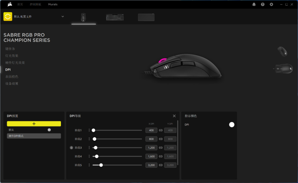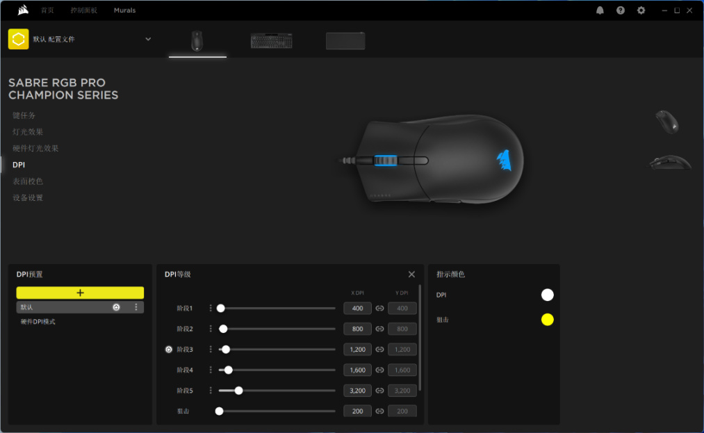 DPI设置方面,Saber RGB Pro圣剑鼠标支持记录5组常用DPI以及一组狙击DPI,并且可以将鼠标在X轴与Y轴的DPI精度进行单独设置,以适应特殊使用需求;