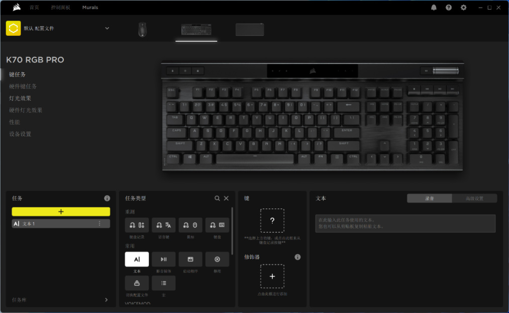在ICUE中,K70 RGB Pro提供了“键任务”功能,玩家可以对键盘上包括滚轮在内的所有按键单独设置功能。通过将文字、组合快捷键、应用程序的启动方式等功能绑定至某个按键上,并使用Fn + 按键的操作,实现快速回复消息、启用组合键或打开特定应用程序的效果;