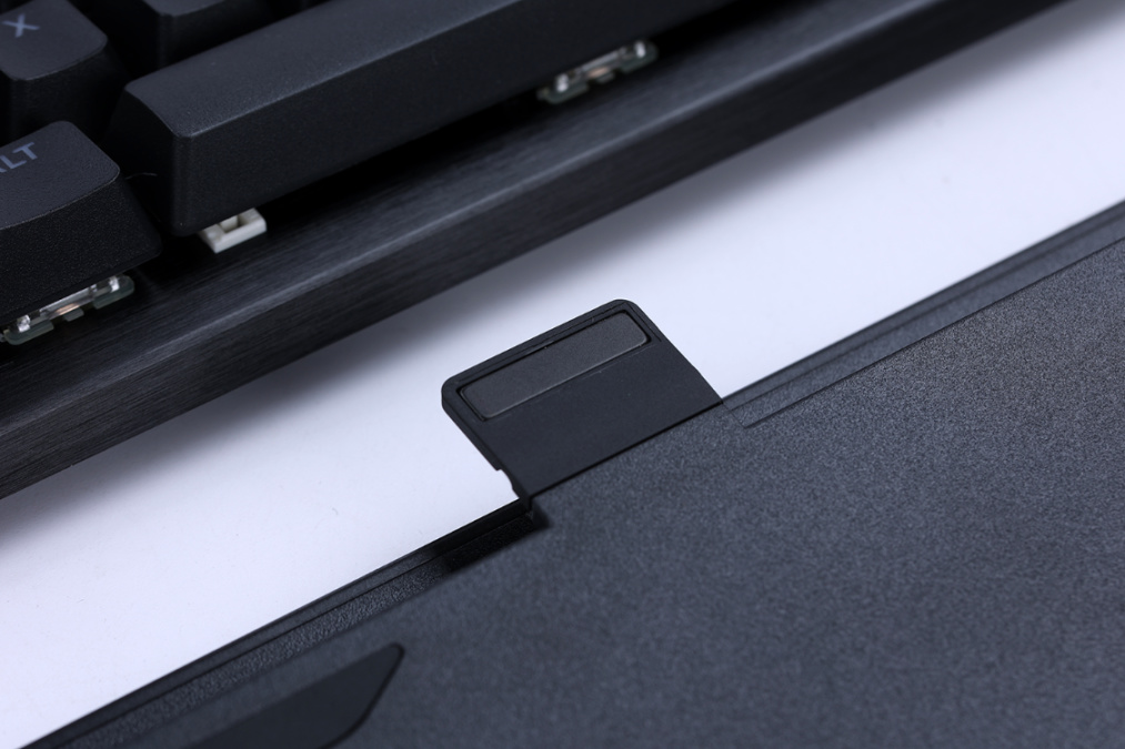 而在键盘线材接口的旁边则是K70 RGB Pro键盘的竞技模式切换开关,开启此开关后,键盘将会一键进入竞技模式,自动将键盘灯效锁定为静态背光模式并禁用所有宏功能,同时,开关下方的翻折式锁扣也可以有效避免因误触;