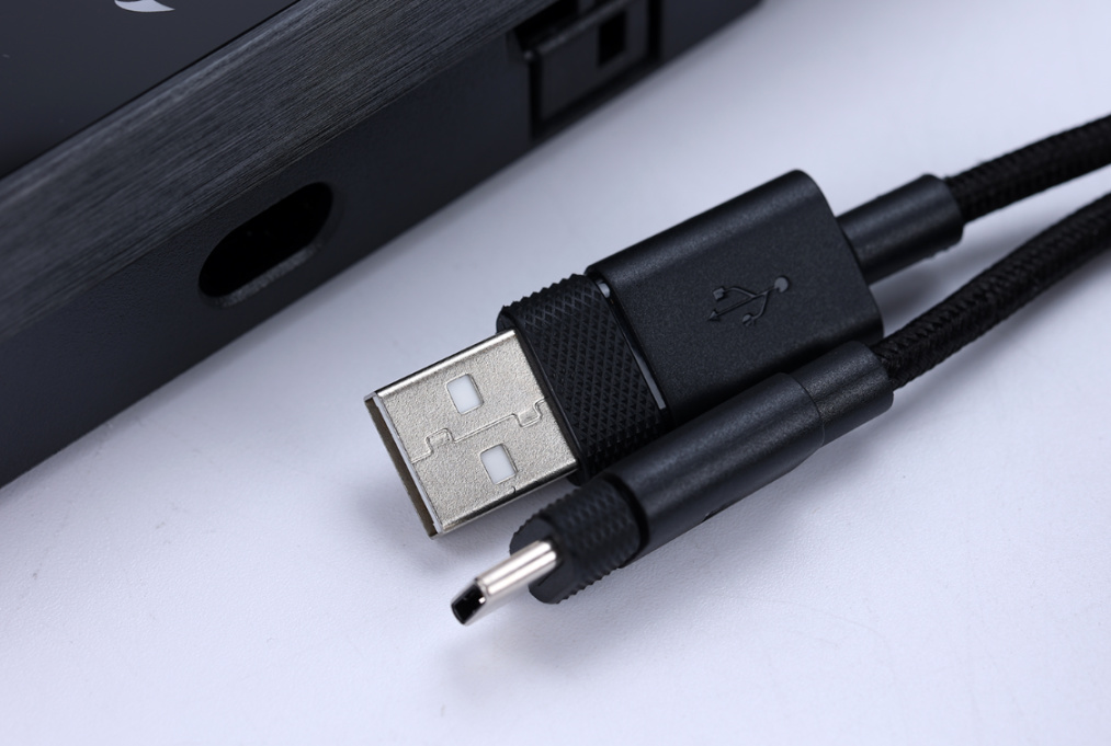 线材接口也采用了抗干扰能力更强的金属外壳接口,接口外侧的塑封环上还有一圈增大摩擦力的纹路,大大降低了插拔时线材的难度,1.8米的线材长度也能适应绝大多数的桌面环境;