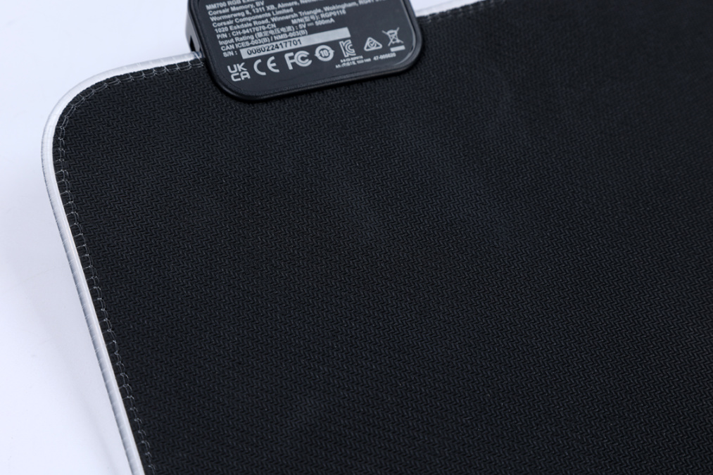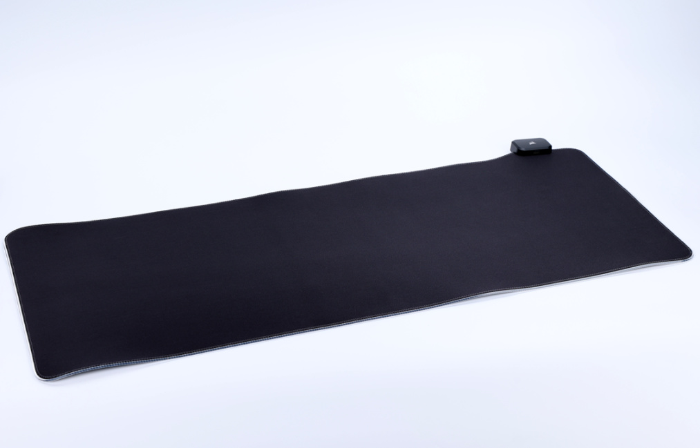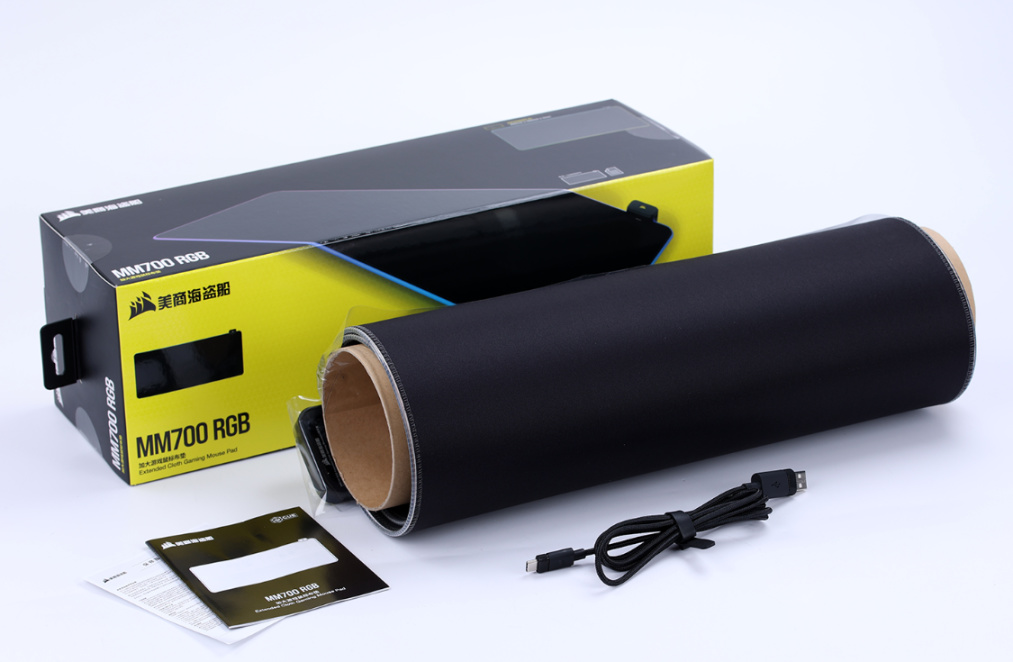 取下固定鼠标垫的胶贴,便可展开整张鼠标垫,美商海盗船MM700 RGB鼠标垫三围:930*400*4mm,整体重量约为1.02KG左右。外观简洁大气,纯黑配色,四周有一圈透明的RGB灯带,右上角则是鼠标垫的灯光控制盒