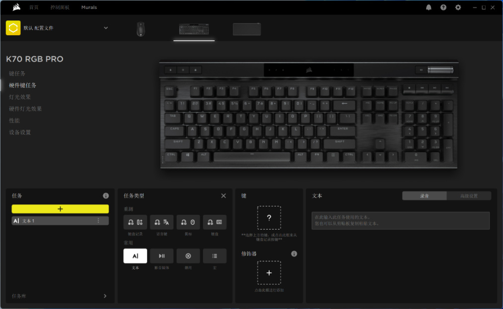 当然,如果想要在脱离了ICUE也能正常使用“键任务”功能的话,只需要在“硬件键任务”的页面中,对键盘进行设置即可,之后,键盘便会将这些设置自动存储在键盘的板载内存中,即便是更换了新的电脑也能正常使用“键任务”功能;