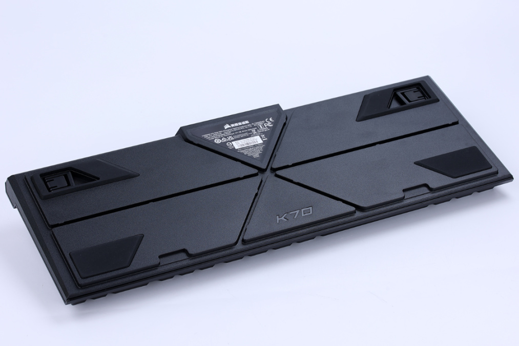 键盘背面的设计个性十足,四角是大面积软胶脚垫,柔软的材质可以有效地避免键盘出现剐蹭桌面的噪音,软胶的材质也大幅提高了键盘的防滑能力,避免了键盘出现键盘满桌跑的尴尬,中间还有K70的阴刻LOGO点缀。3根导流槽则是K70 RGB Pro键盘的线材走线槽,3根共6个方向,无论玩家的桌面布局如何摆放,都能找到合适的键盘出线方向;