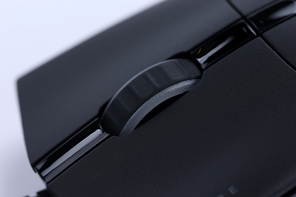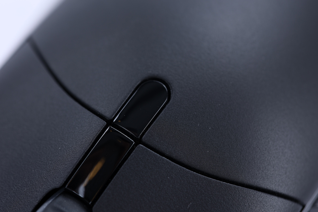 鼠标滚轮采用软质橡胶材质,使用手感舒适,滚动时的阻尼感也很柔和。滚轮两侧的透明导光条则可以在鼠标链接主板后显示灯效;