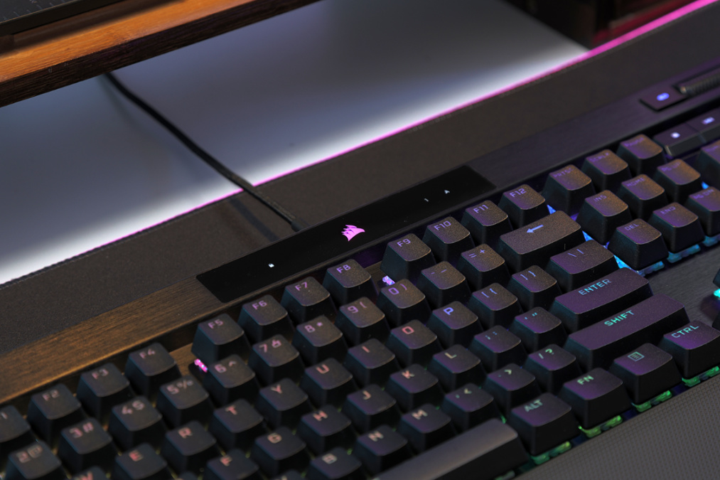 键盘采用全图标式LED指示灯,键盘顶部的中间则是一块黑色透光盖板,盖板中心则是支持RGB灯效同步的海盗船白色LOGO进行点缀,LOGO两侧则是显示小键盘、大写键、键盘锁定等功能开启状态的图标式LED指示灯;