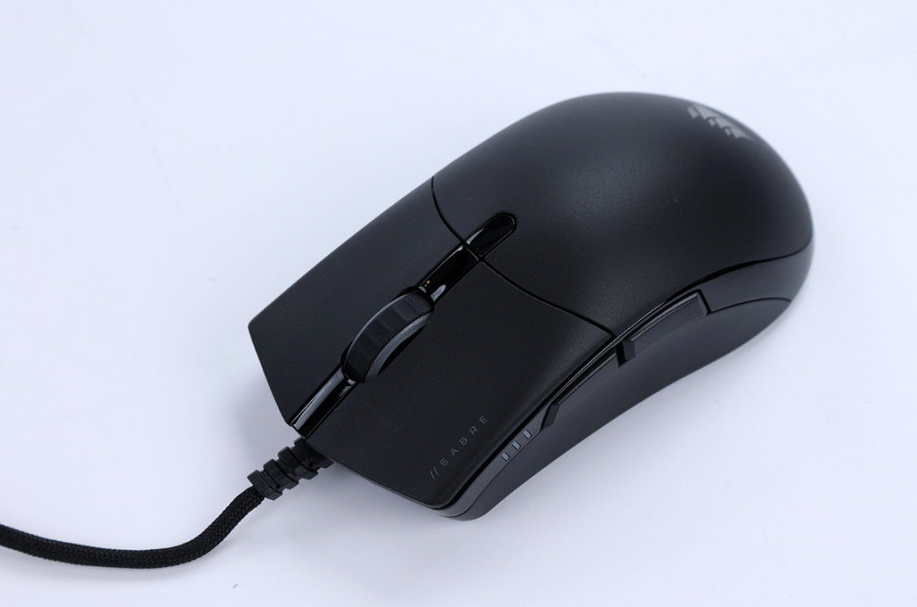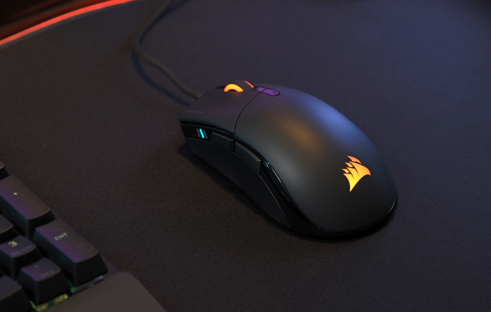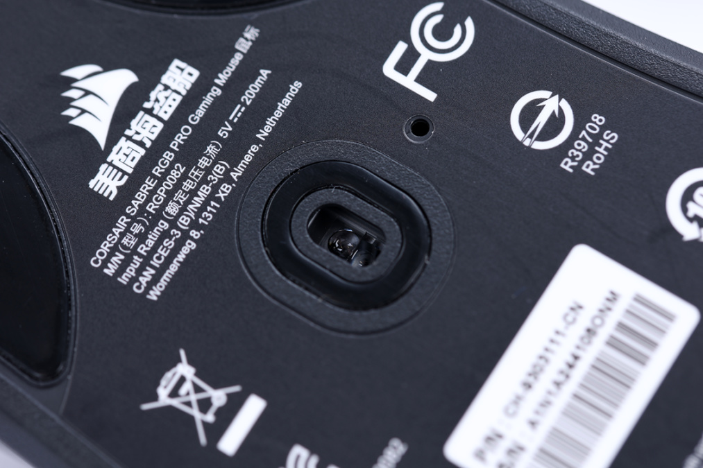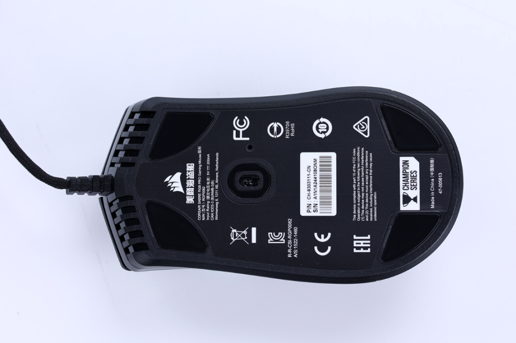 鼠标整体为纯黑配色的塑料材质外壳,外壳表面采用了表面磨砂工艺处理,实际上手体验的手感十分细腻。鼠标尾部的海盗船LOGO则支持RGB灯效控制,乳白色的半透明材质LOGO搭配上LOGO边缘处的精细化处理,可以让灯效得到十分均匀的展现。