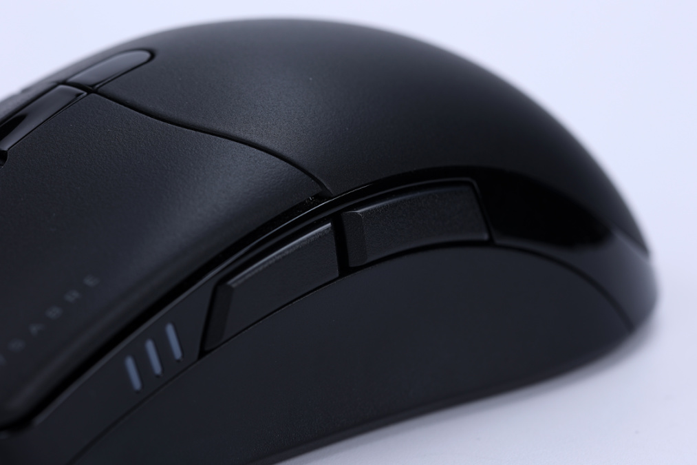 圣剑鼠标采用了原相定制的PixArt 3392原生光学引擎,最大速度可达450 IPS,最大加速度可达50G,支持100~18000 DPI的超大可调整范围,最小支持1 DPI的高精度微调,搭配上鼠标中部的DPI切换按钮,可以实现5挡DPI配置调节。同时,鼠标侧面的DPI示意灯组也会根据不同档位的DPI闪烁不同颜色的灯效;