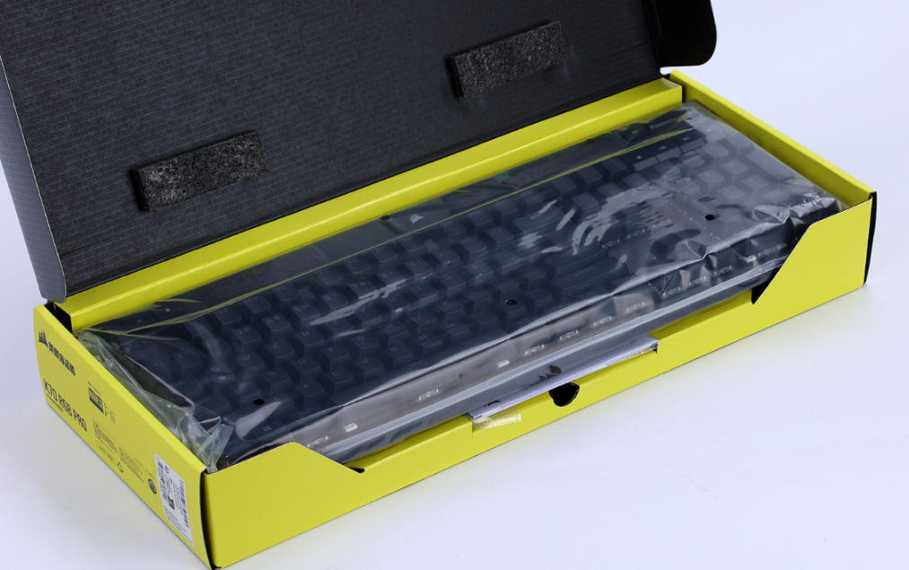 直接开箱,包装内部是由硬纸弯折出的防震缓冲结构,还有两块海绵垫进行辅助固定,键盘本体有防静电袋进行包裹。