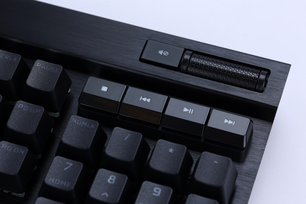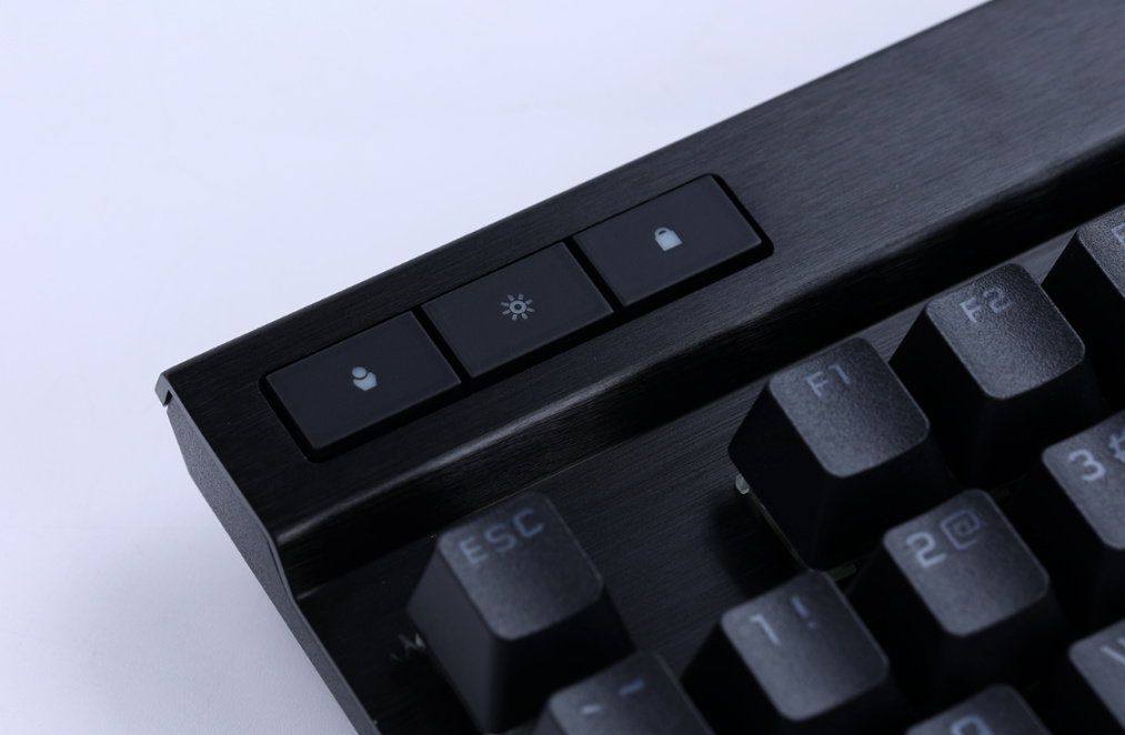 除104个常规键位外,键盘还在其顶部提供了8个独立功能键与1个快捷滚轮。左上角的三个功能键可以控制键盘的配置文件切换、亮度调整以及键盘锁定的功能。右上角则是控制音量调节的滚轮与切换上下曲的媒体控制快捷键;其中,控制音量调节的滚轮也采用了全铝合金材质制成,滚轮表面还刻有增大摩擦力的三角形纹路,手感表现很棒;