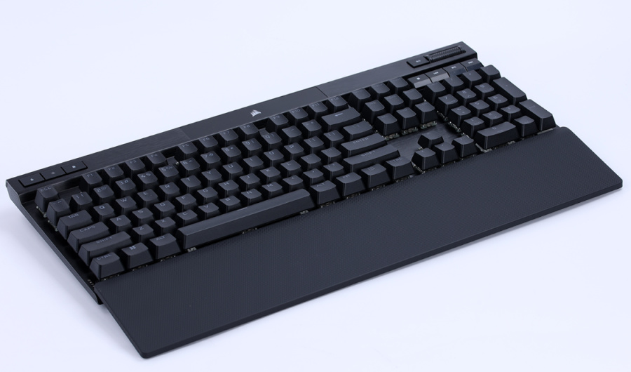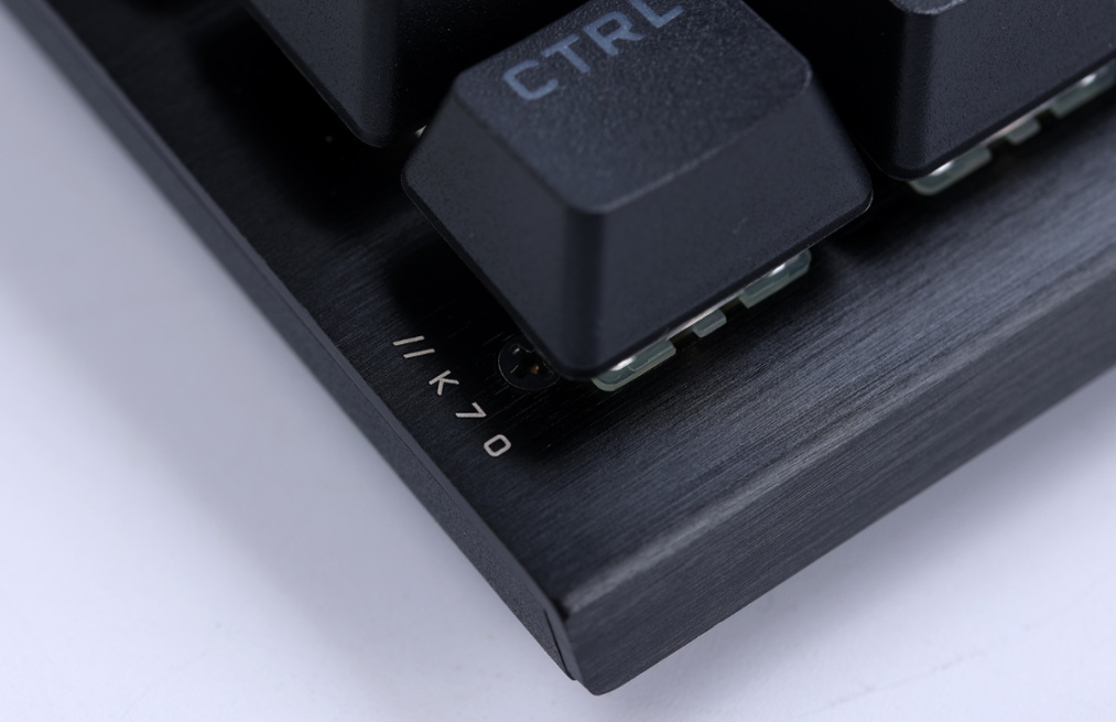 键盘采用了常规的104配列,键盘三围:444*166*40mm,键盘重量约为1.15KG,质感十足。整体纯黑的配色看上去十分的沉稳低调,键盘的上盖则采用了一整块铝制金属面板,面板表面则经过阳极氧化拉丝工艺进行了处理,手感与质感的表现十分优秀,盖板的左下角还有“K70”的装饰铭文;