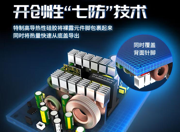 对于入门级的电源,基本只有2个要求,一个就是足瓦,另外一个就是安全,七防芯算是入门级里安全防护做的最好的了吧,导热硅胶全覆盖的设计独一家,在入门级电源里算是设计非常用心的了,虽然略贵了一点,但是整体相对更加安全。