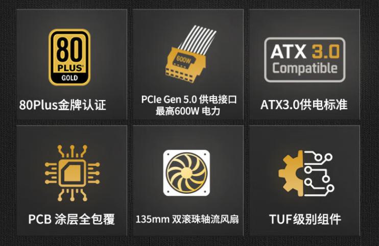 理论上来说,锐龙7 7800X3D+RTX4070Ti 650W的电源是够用了的,不过游戏主机建议电源还是配足,指不定哪天忍不住换了更高级的CPU或是显卡,功耗都不容小觑,正好618价格优惠,建议电源还是一次到位,质保期很长,也可以用很久。TUF GAMING 装弹手750W我非常推荐,虽然比同规格电源要略贵一点,但是用料扎实,而且还是ATX3.0标准,PCB上包裹了三防涂层(防尘、防潮、防高温),电源自带的全模组线材为压纹线,质保期还特别长,非常适合追求稳定的游戏党,性价比非常高。