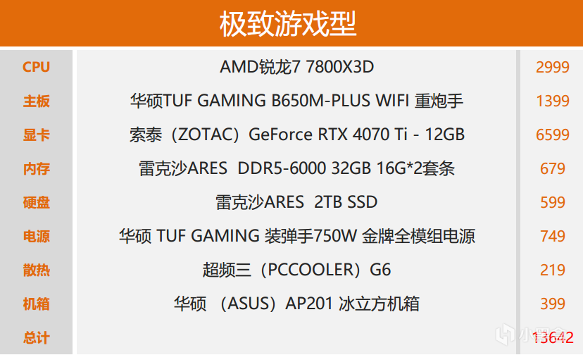 既然是以极致游戏为目标,预算的大头都自然要都给到CPU和显卡,其他配件尽量选择性价比产品,所以主板使用了华硕TUF GAMING B650M-PLUS WIFI 重炮手主板,来确保性价比最大化,毕竟3D V-Cache 的CPU就不能超频,3D V-Cache 对电压极其敏感,超频很容易烧毁,所以基本选一个供电能带的动的主板就行。