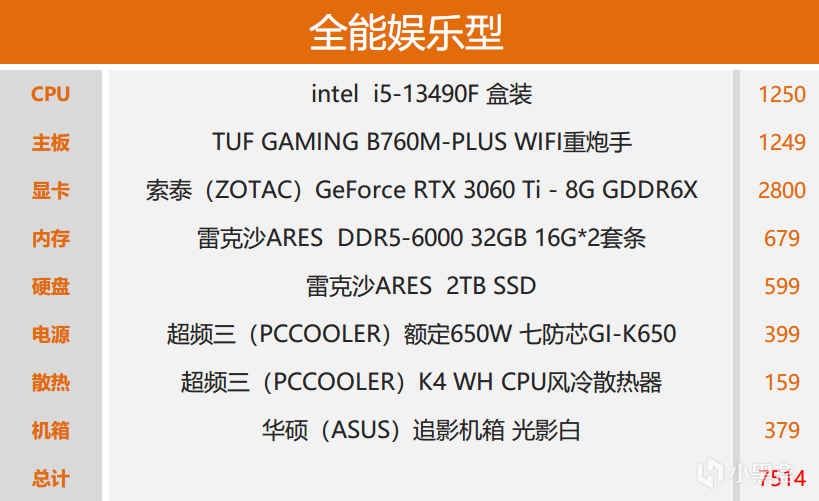 CPU方面,中国特供版的intel i5-13490F 是个不错的选择,目前盒装版的价格已经和intel i5-13400散片价格差不多了,性价比还是不错的。至于主板嘛,自从AMD的主板价格上来了,现在看intel中端主板的价格,也不觉得贵了。。。如今DDR5价格下来了,如果手上没有D4内存,或者D4内存频率过低,建议还是直接入手D5版的主板,不然未来升级又得重新买内存。