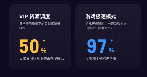 而在游戏等重度使用场景下,它则能够让可被感知的卡顿次数相较Flyme 9降低97%之高。