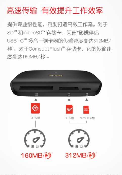 ▲推荐完了TF卡与SD卡,这里再推荐两款读卡器,首先是这款影像伴侣 三合一 读卡器,其支持TF卡,SD卡与CompactFlash卡的读取。