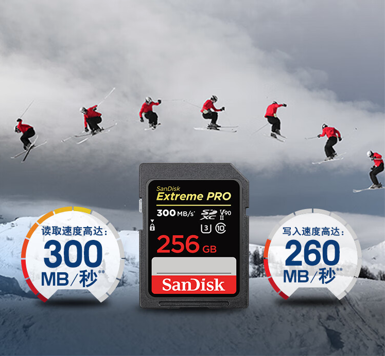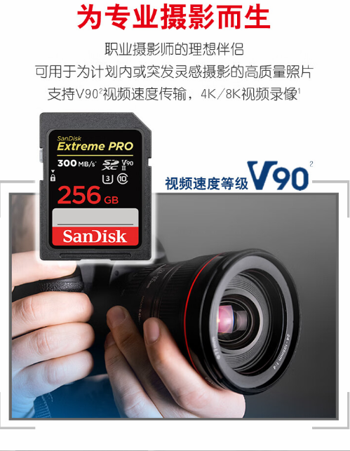 ▲至尊超级速 UHS-Ⅱ 相机储存卡拥有300MB/s的顺序读取速度与260MB/s的顺序写入速度,视频速度等级更是高达V90,足以满足4K/8K视频录像与RAW格式照片连拍对内存卡的需求,可以说性能十分强劲。
