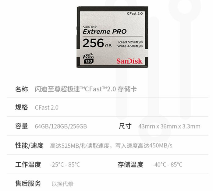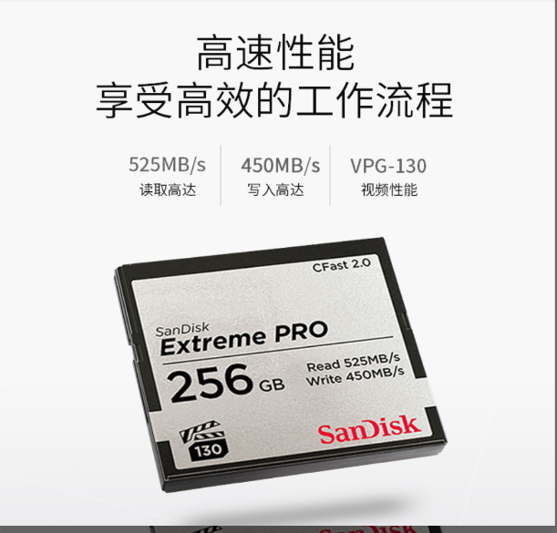 ▲这款至尊超极速 CFast 2.0卡还支持VPG-130规范(最低写入速度130MB/s),因此即使录制影院级的4K视频都不会出现跳帧,足以用于部分视频、照片生产力方面的工作。