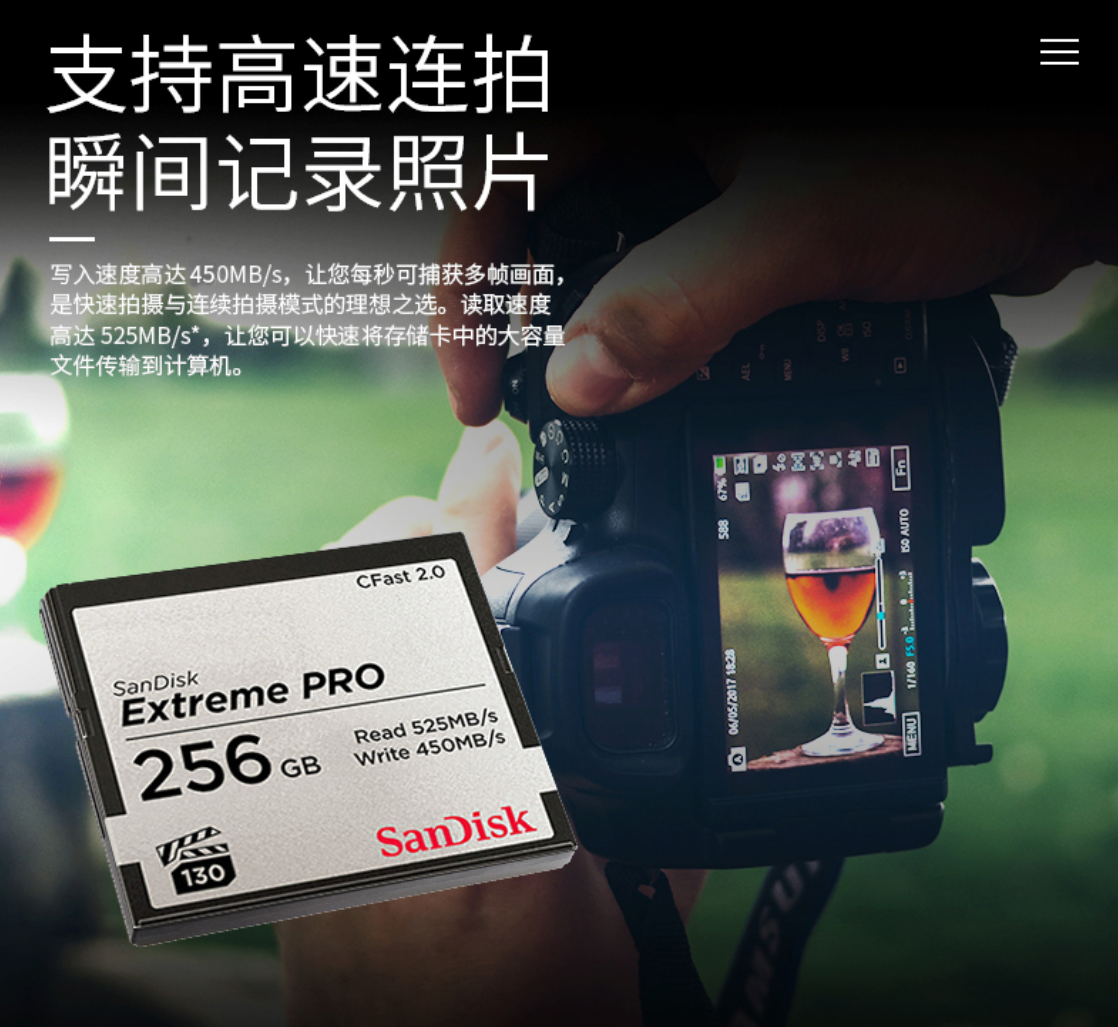 ▲首先推荐一款CFast 2.0协议的至尊超极速版单反相机内存卡,CFast 2.0走的是SATA-Ⅲ 总线协议,因此可以支持更快的读写速度,这款CFast卡拥有525MB/s的顺序读取速度与450MB/s的顺序写入速度,相较于UHS-Ⅱ的SD卡的读写速度均拥有明显优势。