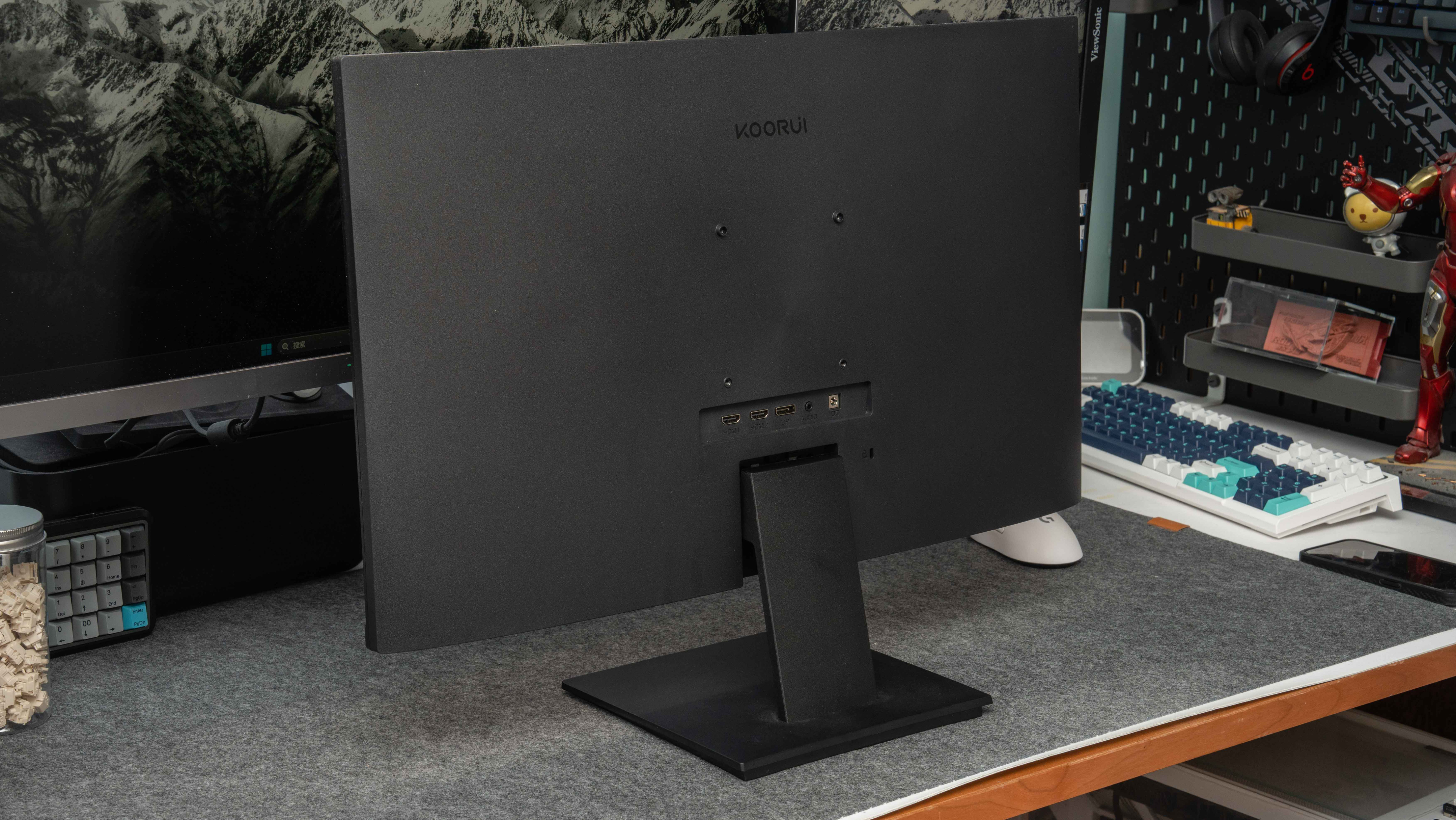 我建议自购一个显示器支架,科睿P6背后有100*100的VESA的支架孔位,之前的图全部都是支架挂的,显示器下方就有更多位置放键盘了,也更好调整显示器的高度。