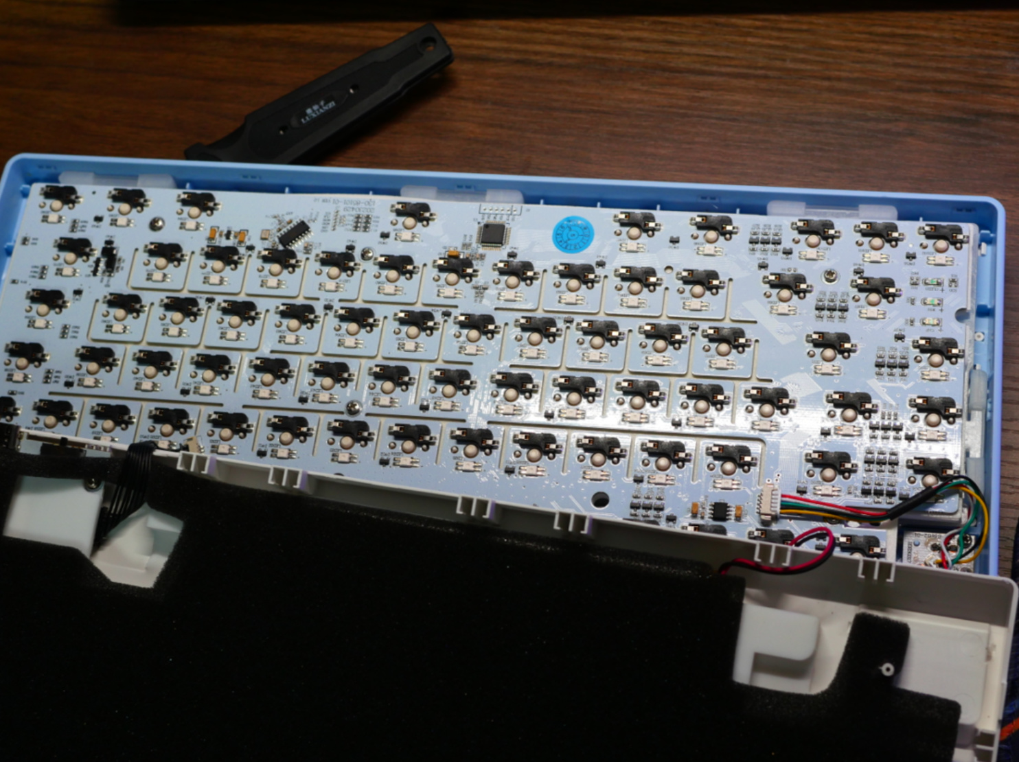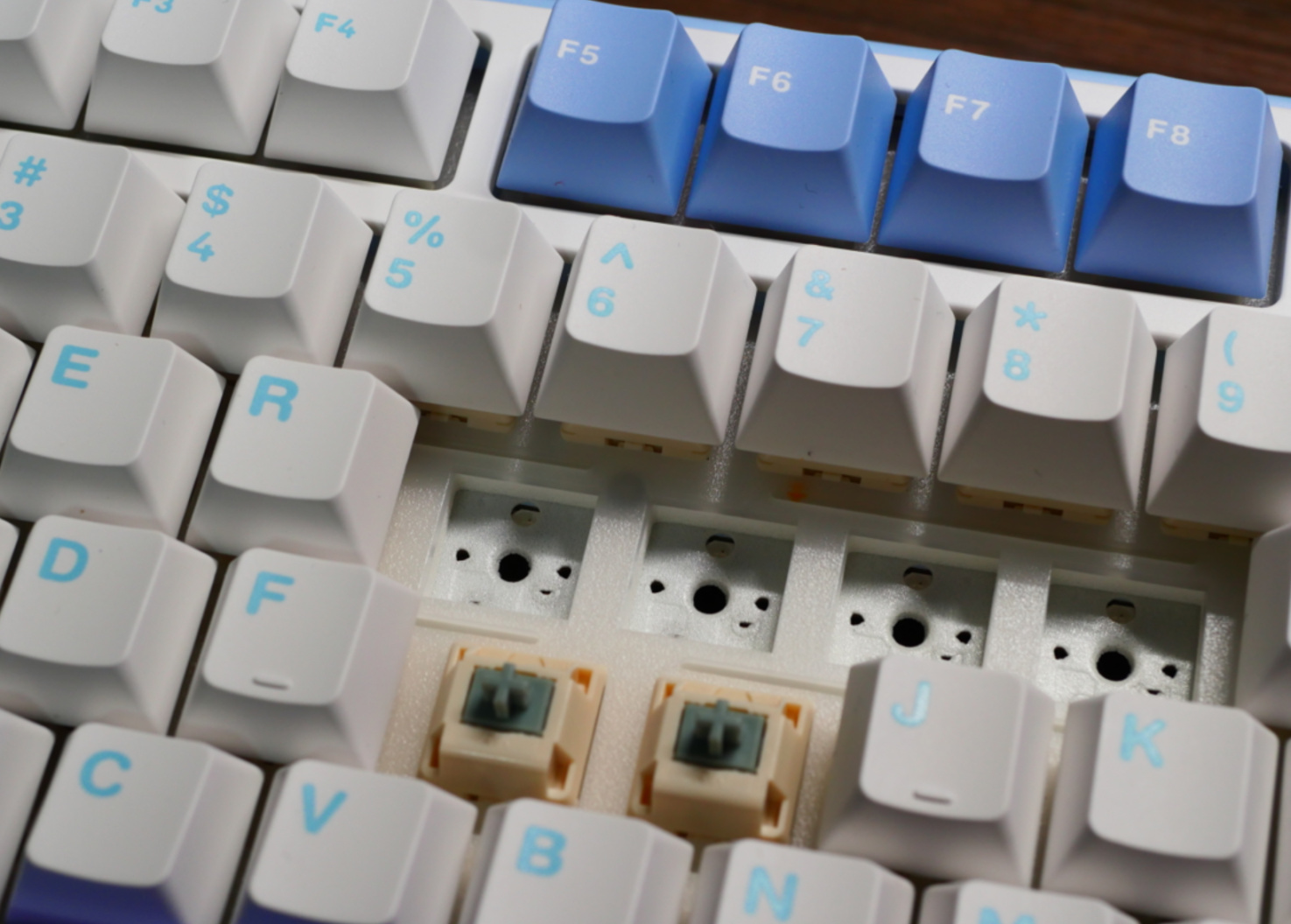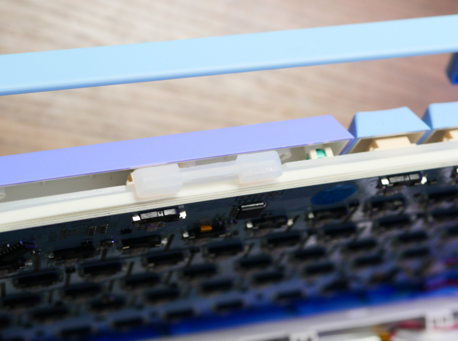大家最关注的肯定是这把键盘的单键开槽,毕竟从4月的RK r98开始,PCB单键开槽+定位板横向开槽就成为了键圈内卷的全新方向。