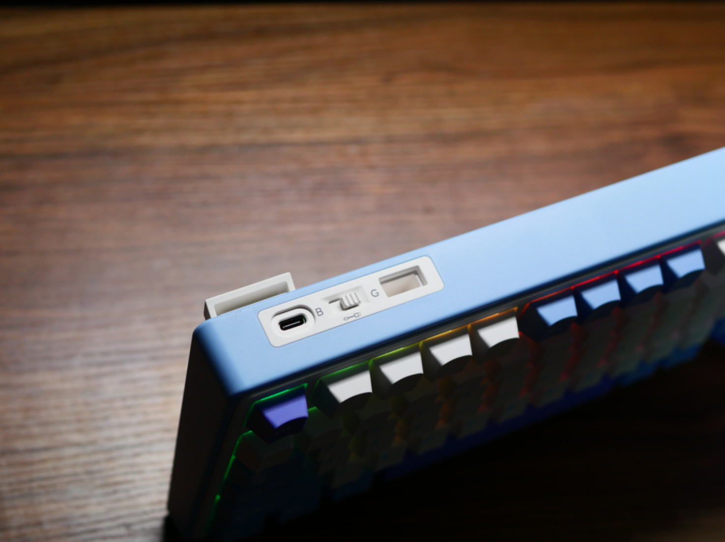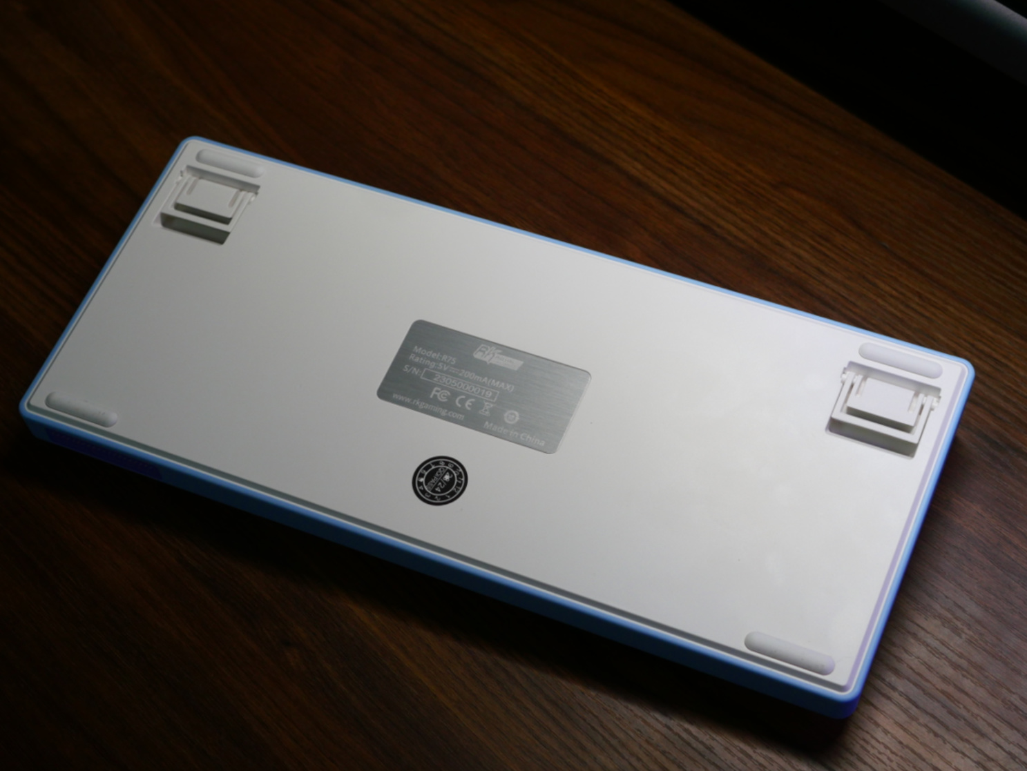 r75外观上有一个反常规的设计,即三模开关的提示符是反过来印的,应该是考虑到我们日常拨动开关的时候基本都是这样把键盘立起来调整的,而这样的角度下,反正印看到的字符正好是正的。哈哈,除非强迫症,我觉得这个设计挺好。