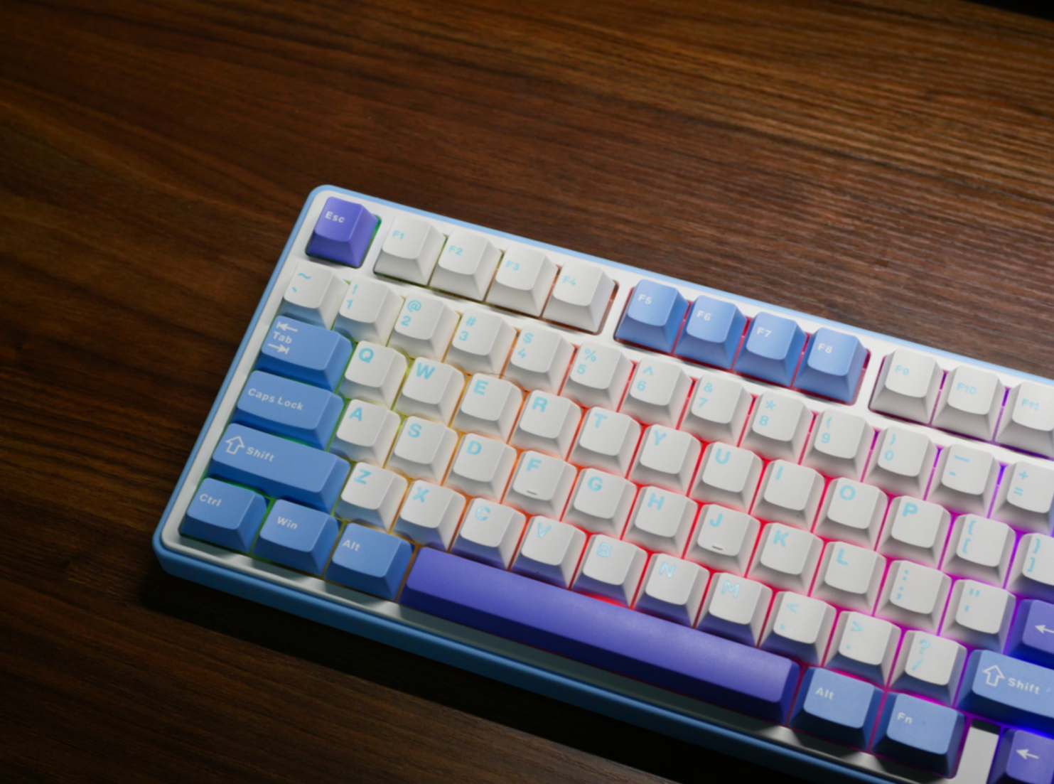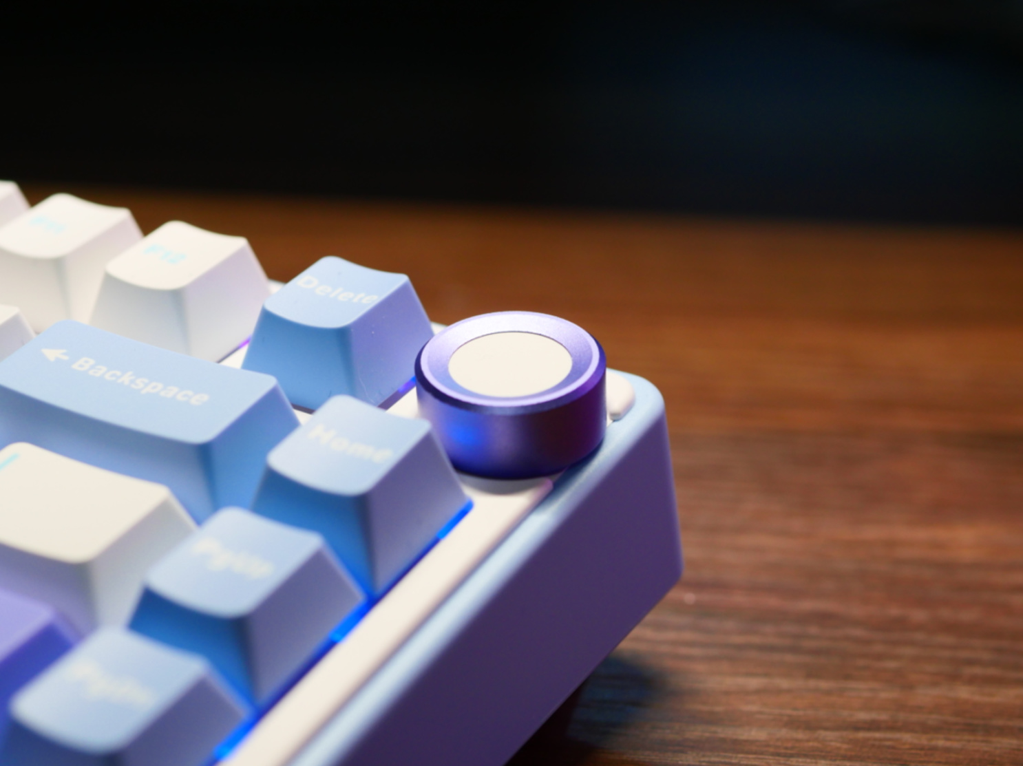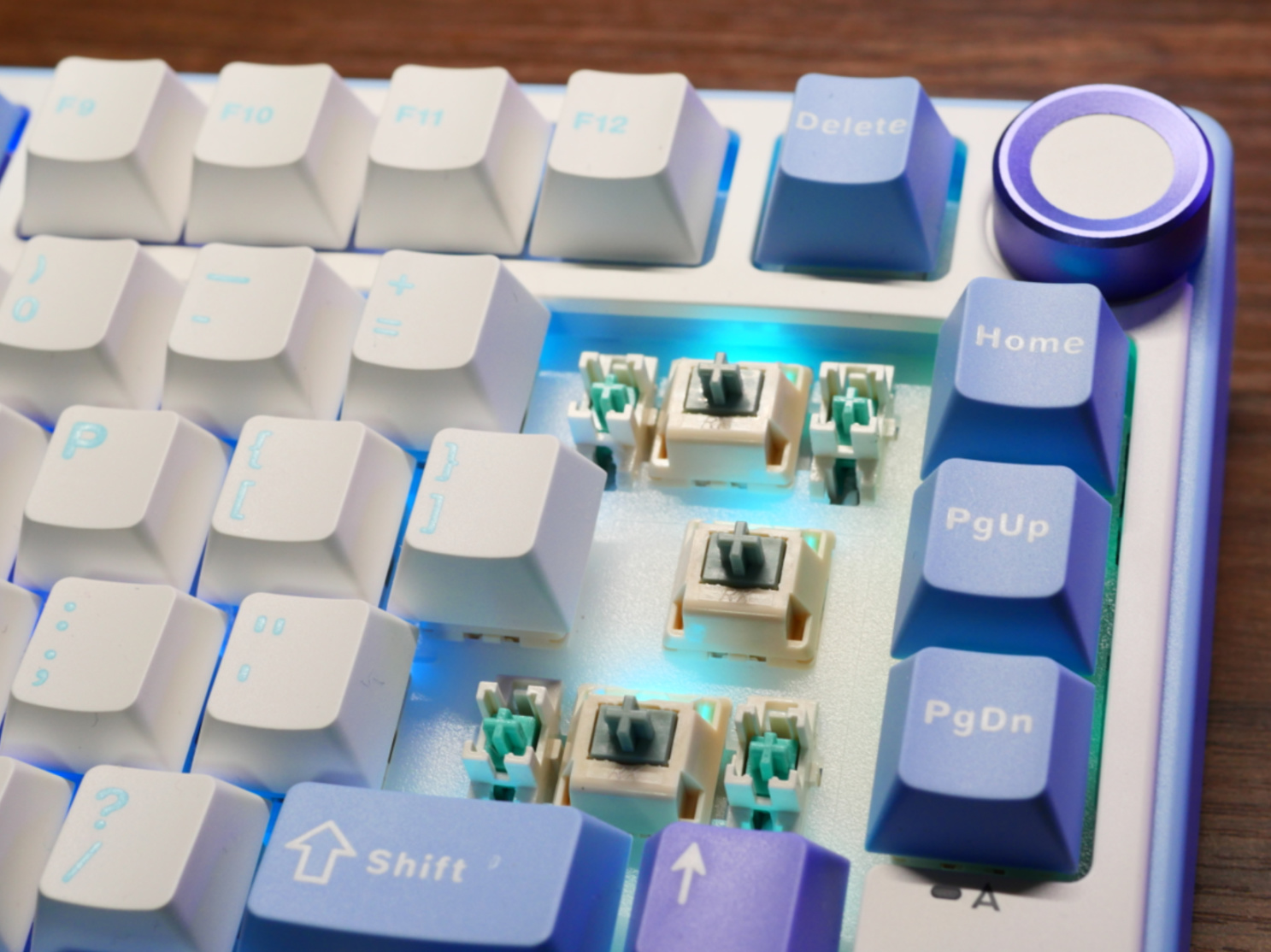 算是一个相对紧凑的设计,方向键没有下沉,三颗功能按键设计在了右侧,F区挤了挤,容下了DEL,这样上下翻页、home和DEL这四颗最主要的功能键是都有了,不像部分75%键盘威慑设计做出了某些残疾配列。