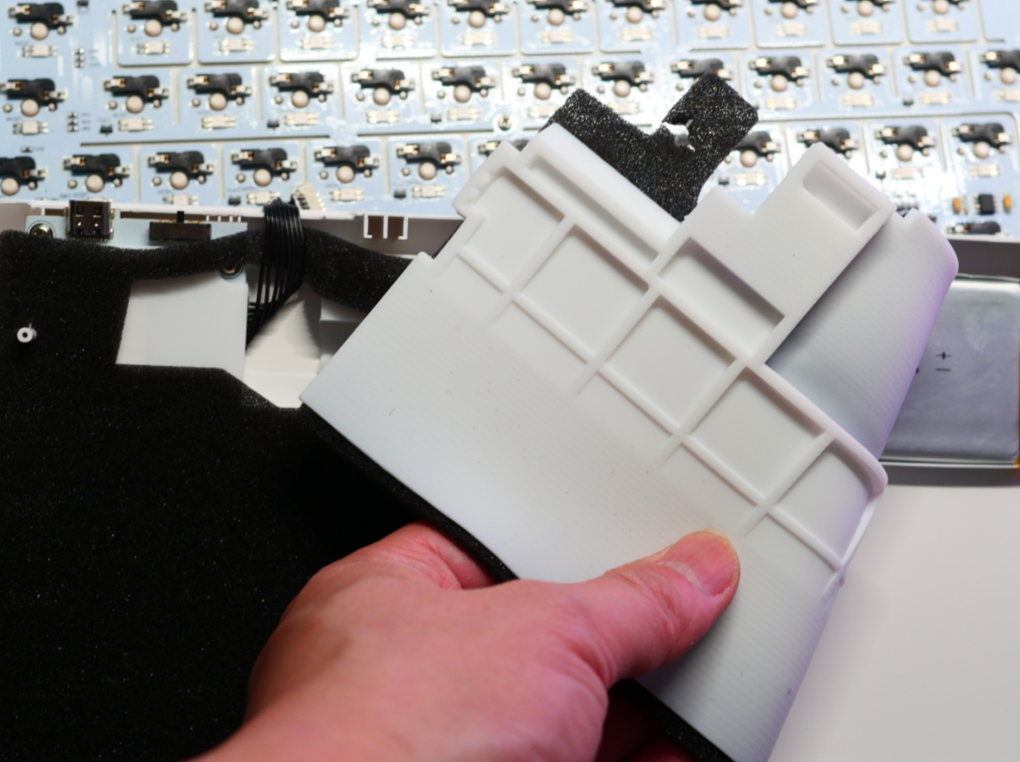 所以,体验这块,先来拆解。可以看到,主键区开槽开的很彻底,基本上主要按键周围三面都开了凹槽。而且PCB也比常规薄一点,为1.2mm,也是为了更大的弹性。