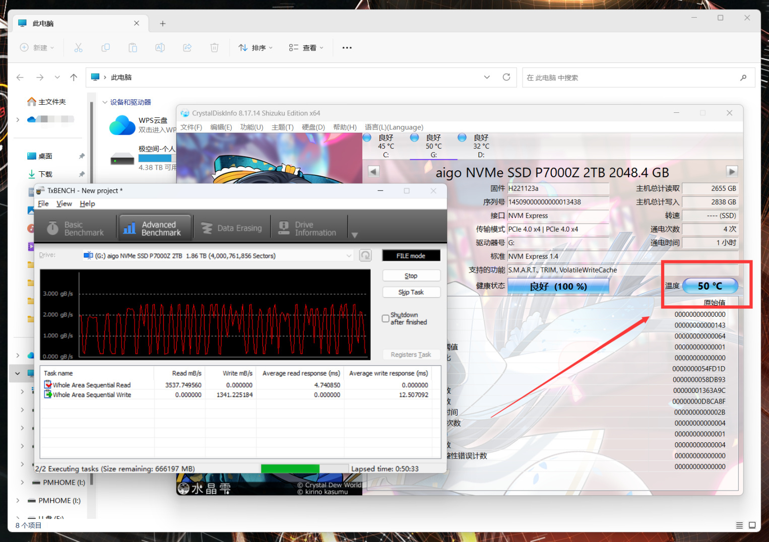 没加装散热马甲的固态硬盘工作温度温度在50°,考虑到马上到夏天了,打算7*24小时开机持续读写的用户一定要注意降温,主板带散热马甲就装上,没有的话建议加装一个被动散热片。