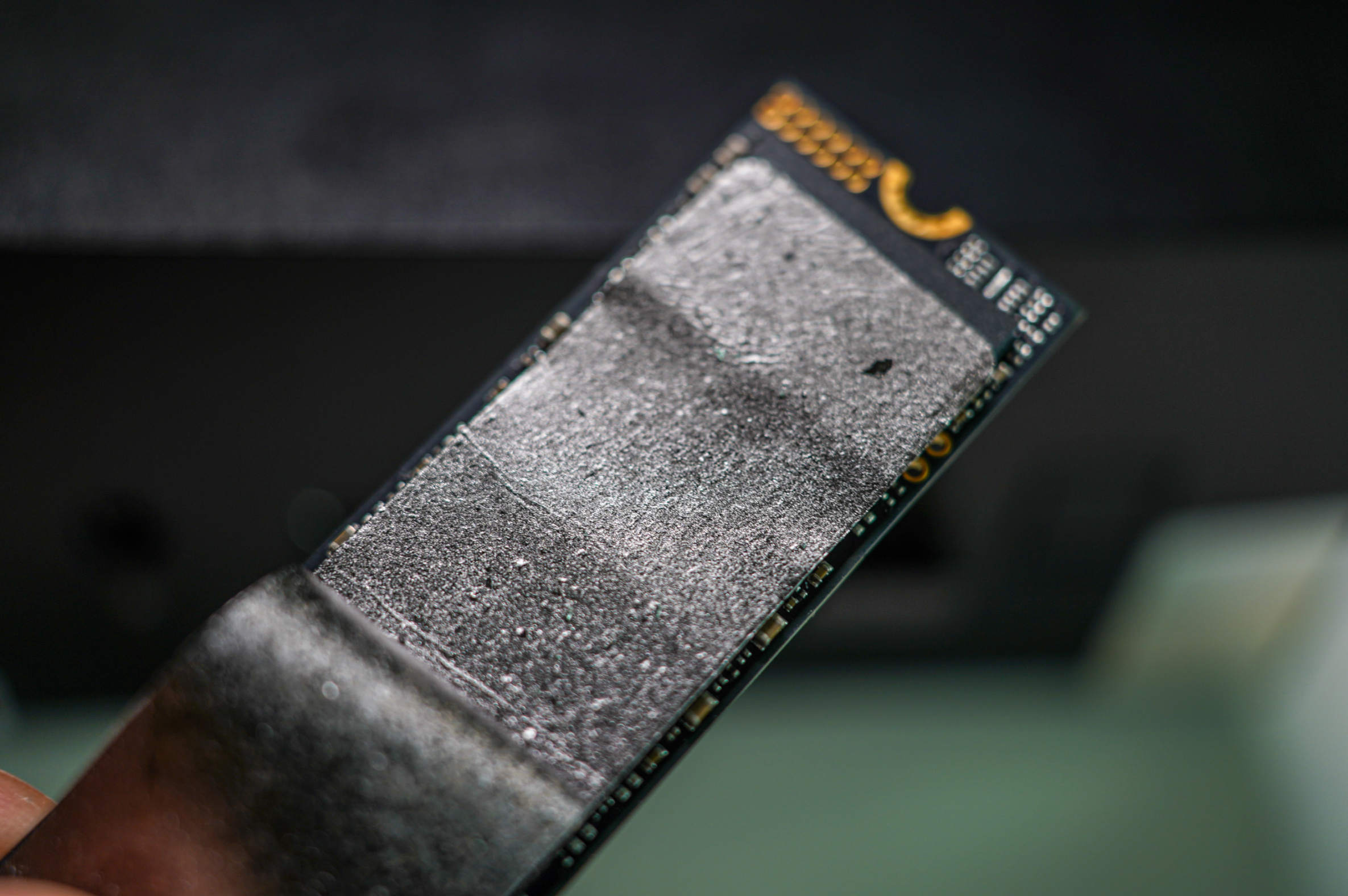 贴纸采用的是石墨烯夹层方案,这种辅助散热的方案现在很多硬盘厂商都在使用,但是得吐槽下赶工痕迹比较重,很轻松就能撕开贴纸的夹层。