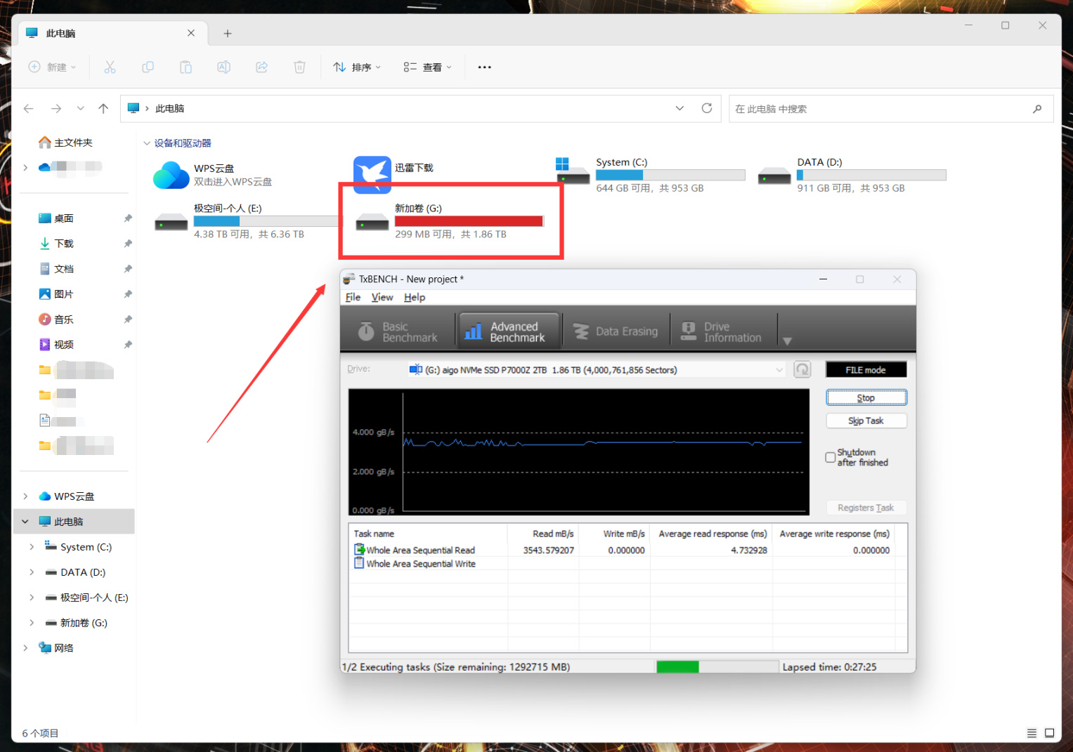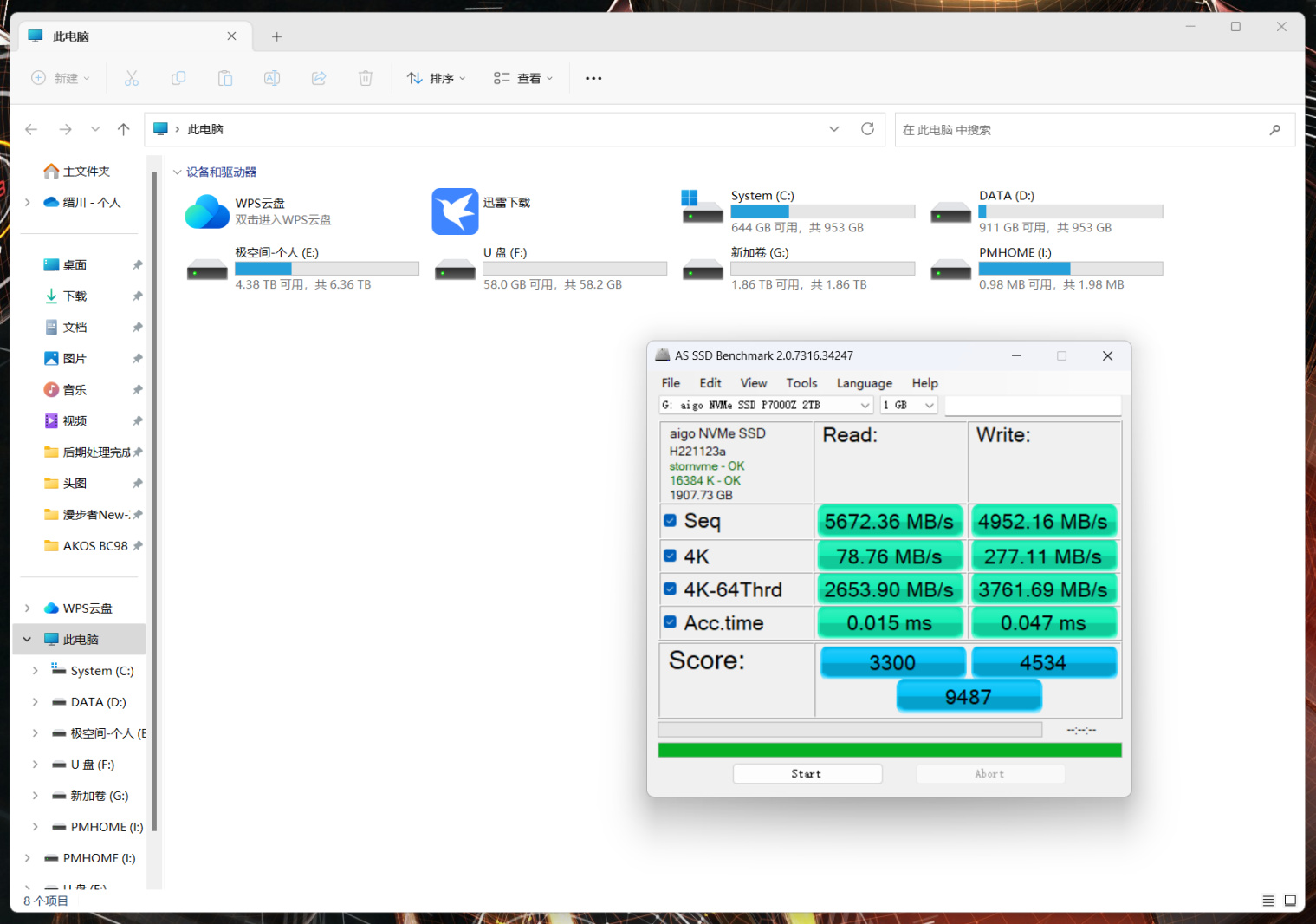 单个颗粒大小为1GB,一共有两个错开焊在PCB上,两片贴片减少了信号传输路径距离,减少了信号干扰与反射。Logo虽然贴的是aigo,实际上就是Xtacking 3.0技术的232层的长存颗粒,接下来准备开始进行性能测试。