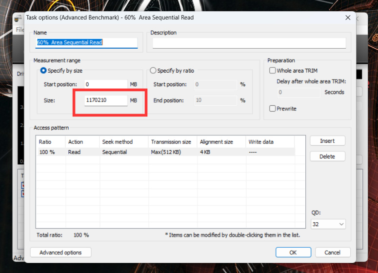 由于满盘的掉速比较多,这里测试下预留多少的空闲空间比较合适,手动调整TxBench的测试配置到40%空闲率进行对比测试: